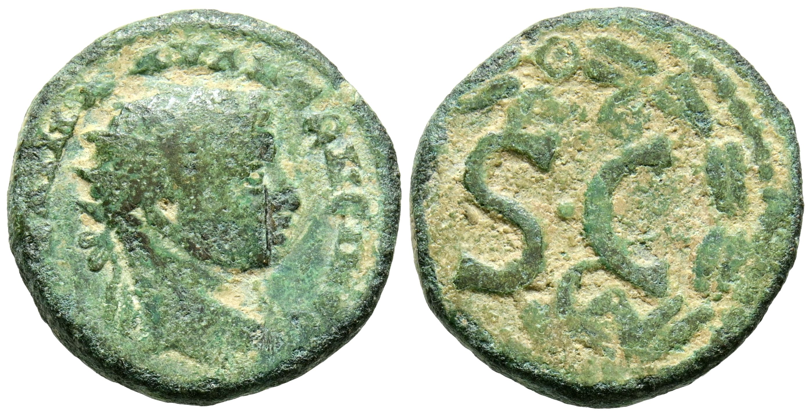 HELIOGABALO. Ae18. (Ae. 4,89g/19mm). 218-222 d.C. Seleucis y Pieria, Antioquía. (McAlee 782-783). Anv: Cabeza laureada de Heliogábalo a derecha, alrededor leyenda: AVT KAI M AV ANTΩNԐINOC CԐ. Rev: SC, encima AE, debajo águila, todo dentro de corona d e laurel. MBC-.