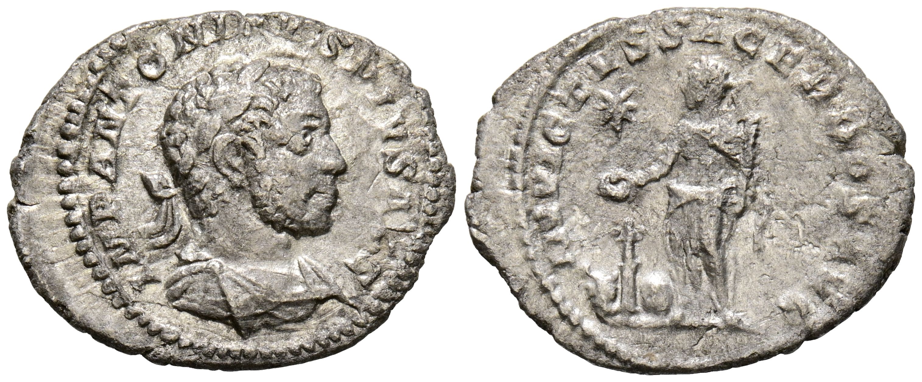 HELIOGABALO. Denario. (Ar. 1,96g/21mm). 218-222 d.C. Roma. (RIC 88). Anv: Busto laureado y drapeado de Heliogábalo a derecha, alrededor leyenda: IMP ANTONINVS PIVS AVG. Rev: Heliogábalo estante a izquierda portando patera sobre trípode y mazo, a sus pies toro tumbado, en campo estrella, alrededor leyenda: INVICTVS SACERDOS AVG. MBC.