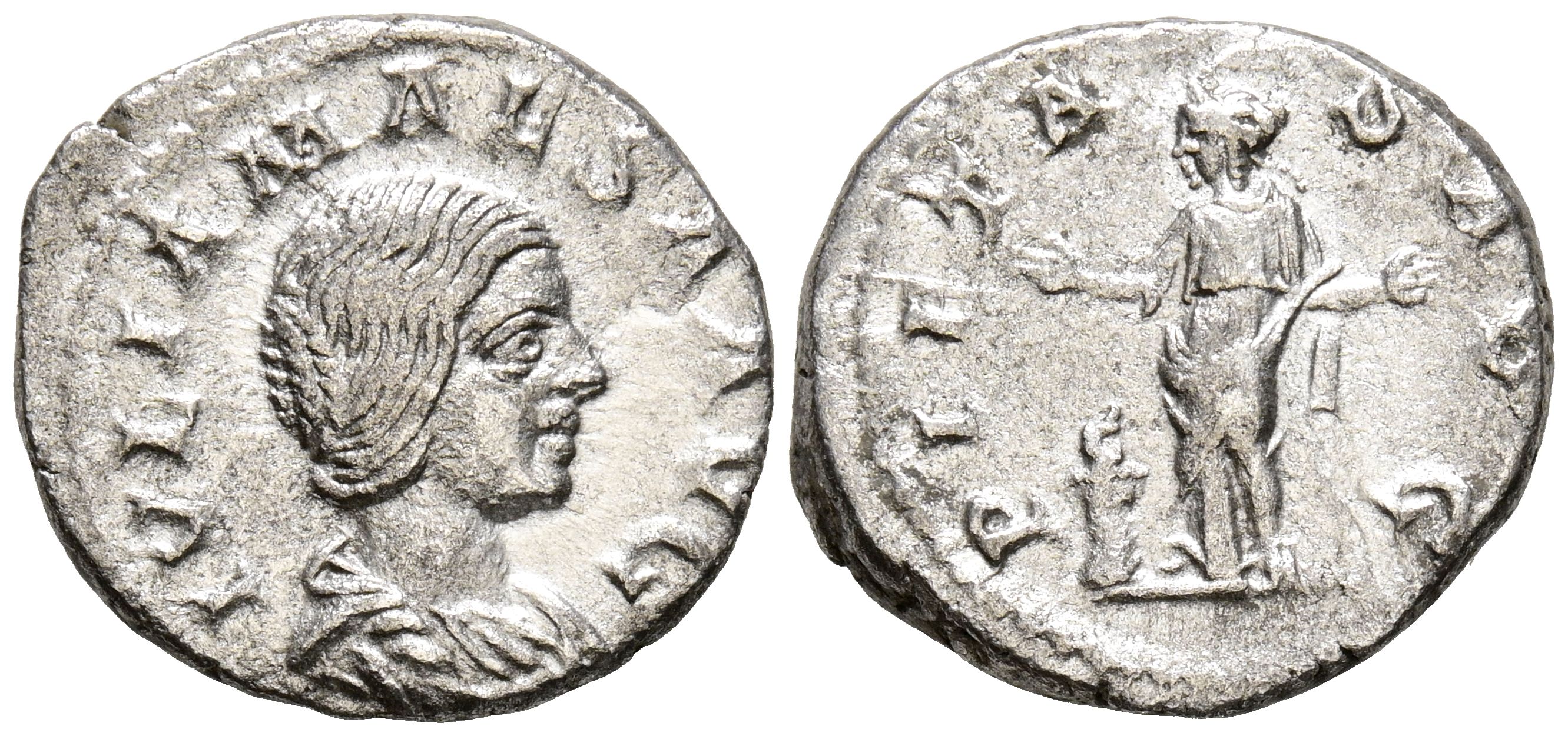 JULIA MAESA. Denario. (Ar. 3,79g/19mm). 218-220 d.C. Roma. (RIC 263). Anv: Busto drapeado de Julia Maesa a derecha, alrededor leyenda: IVLIA MAESA AVG. Rev: Pietas estante a izquierda portando patera sobre altar, alrededor leyenda: PIETAS AVG. MBC.