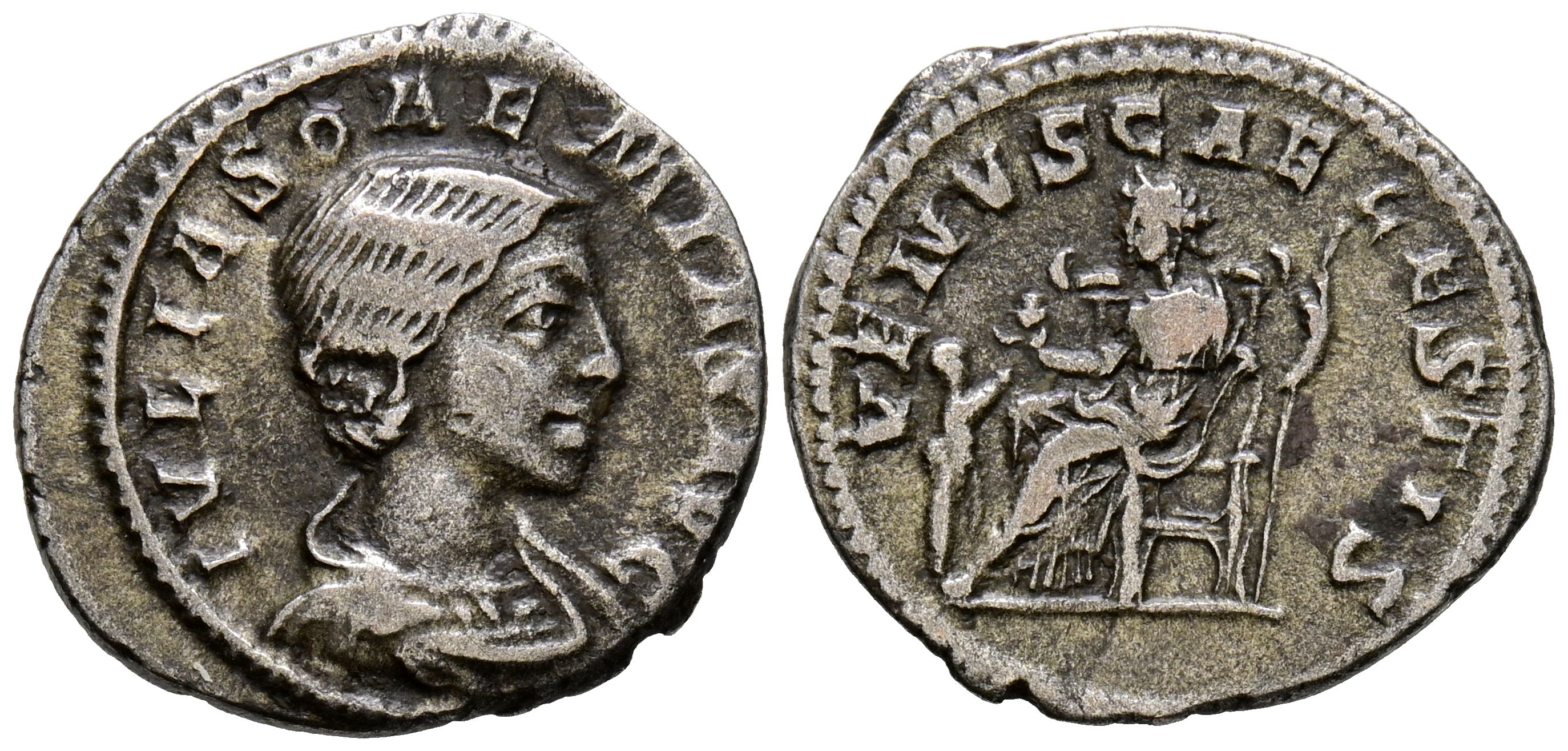 JULIA SOEMIAS. Denario. (Ar. 2,53g/19mm). 218-222 d.C. Antioquía. (RIC 243). Anv: Busto drapeado de Julia Soemias a derecha, alrededor leyenda: IVLIA SOAEMIAS AVG. Rev: Venus sentada a izquierda sosteniendo manzana y cetro, a sus pies niño, alrededor leyenda: VENVS CAELESTIS. MBC.