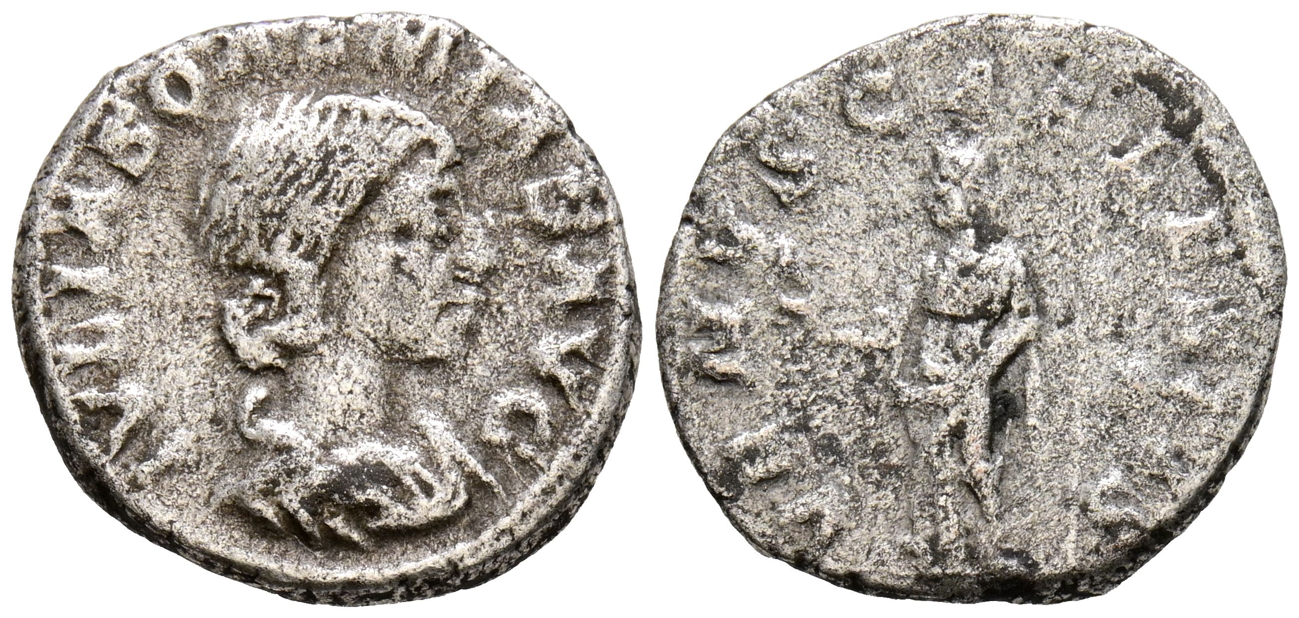 JULIA SOAEMIAS. Denario. (Ar. 2,58g/18mm). 220-222 d.C. Roma. (RIC 241). Anv: Busto drapeado de Julia Soaemias a derecha, alrededor leyenda: IVLIA SOAEMIAS AVG. Rev: Venus estante a izquierda portando globo y cetro, en campo estrella, alrededor leyenda: VENVS CAELESTIS. MBC-. Porosidad.