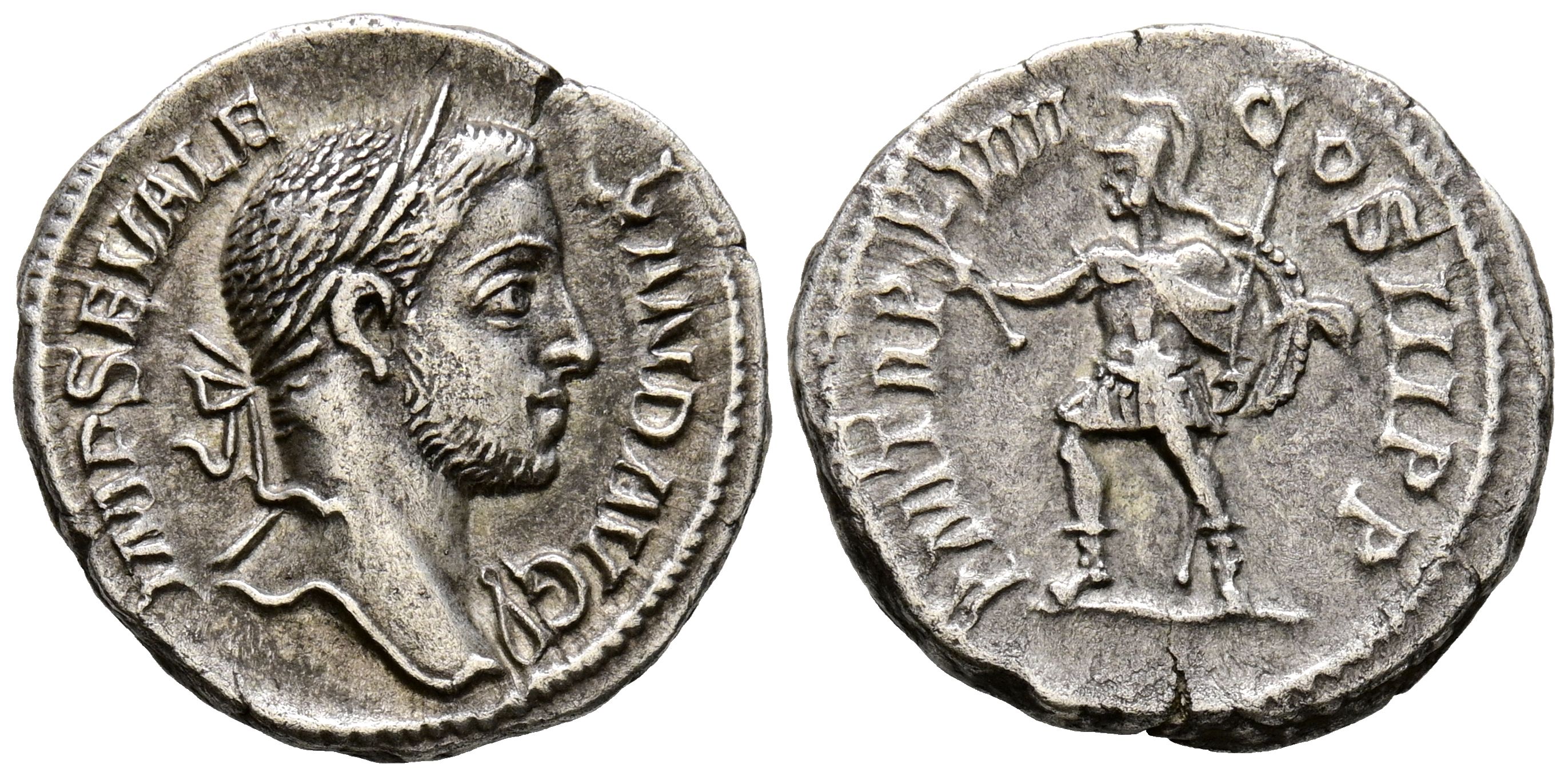 ALEJANDRO SEVERO. Denario. (Ar. 3,49g/18mm). 229 d.C. Roma. (RIC 92). Anv: Cabeza laureada de Alejandro Severo a derecha, alrededor leyenda: IMP SEV ALEXAND AVG. Rev: Marte avanzando a izquierda portando rama, lanza y escudo, alrededor leyenda: P M TR P VIII COS III P P. MBC+.