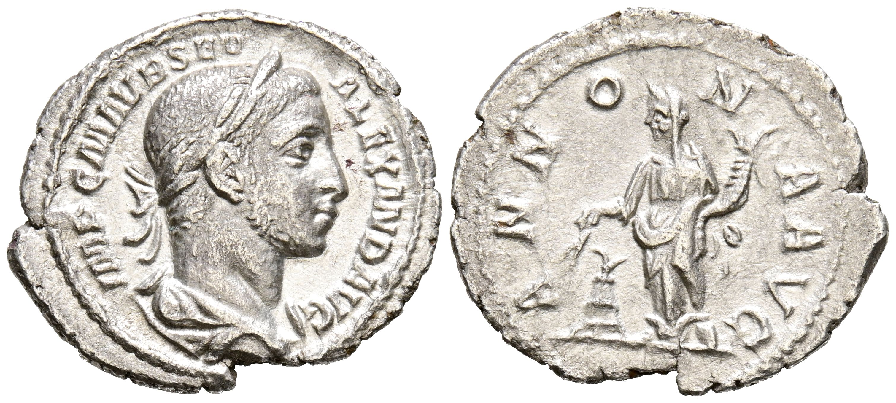 ALEJANDRO SEVERO. Denario. (Ar. 1,93g/21mm). 228 d.C. Roma. (RIC 135). Anv: Busto laureado y drapeado de Alejandro Severo a derecha, alrededor leyenda: IMP C M AVR SEV ALEXAND AVG. Rev: Annona estante a izquierda portando espigas sobre modio y cornucopia, alrededor leyenda: ANNONA AVG. MBC/MBC+.