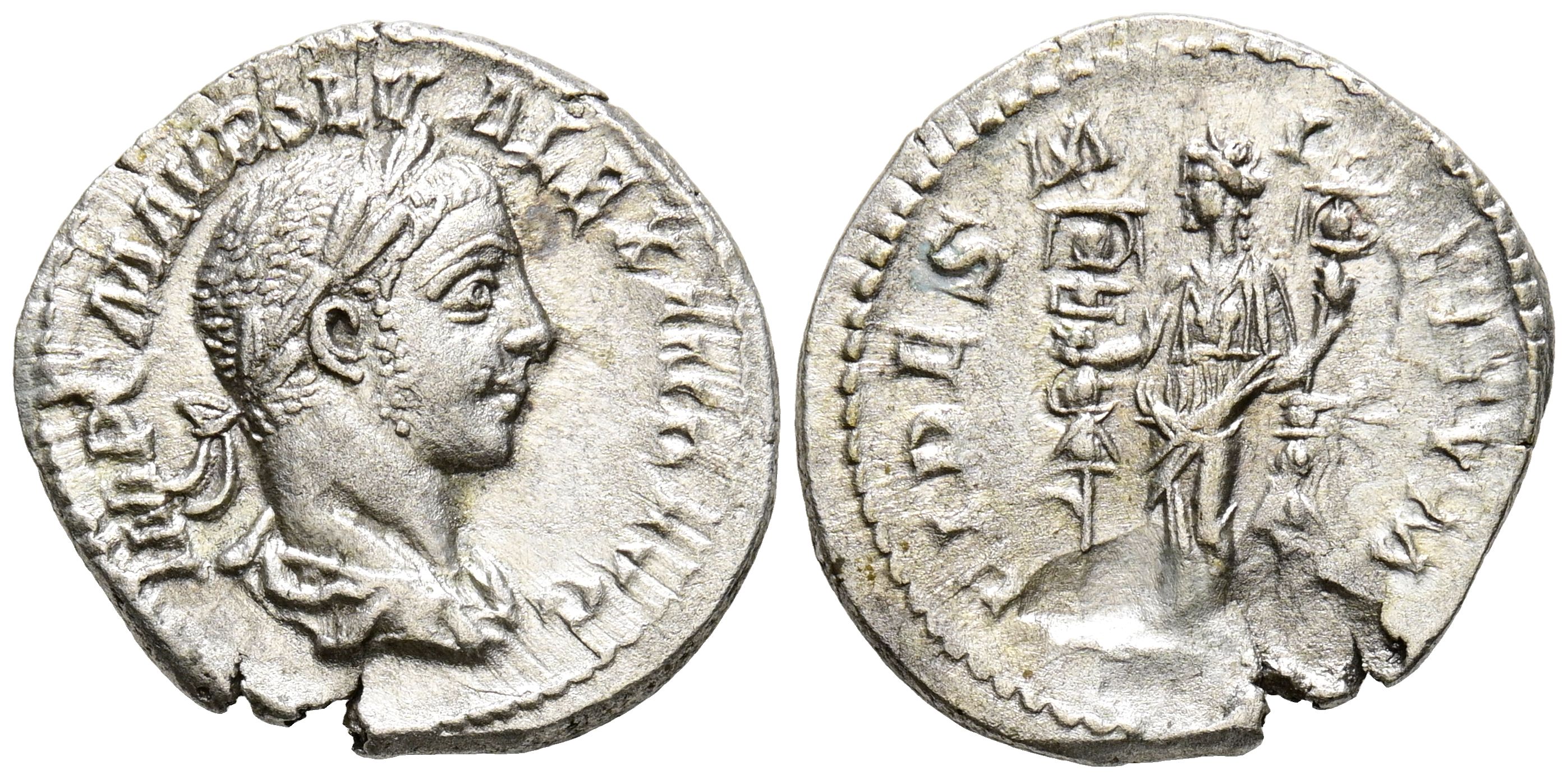 ALEJANDRO SEVERO. Denario. (Ar. 3,09g/20mm). 225 d.C. Roma. (RIC 139). Anv: Busto laureado y drapeado de Alejandro Severo a la derecha, alrededor leyenda: IMP C M AVR SEV ALEXAND AVG. Rev: Fides estante a izquierda con dos estandartes, alrededor de la leyenda: FIDES MILITVM. MBC. Defecto de acuñación en reverso.