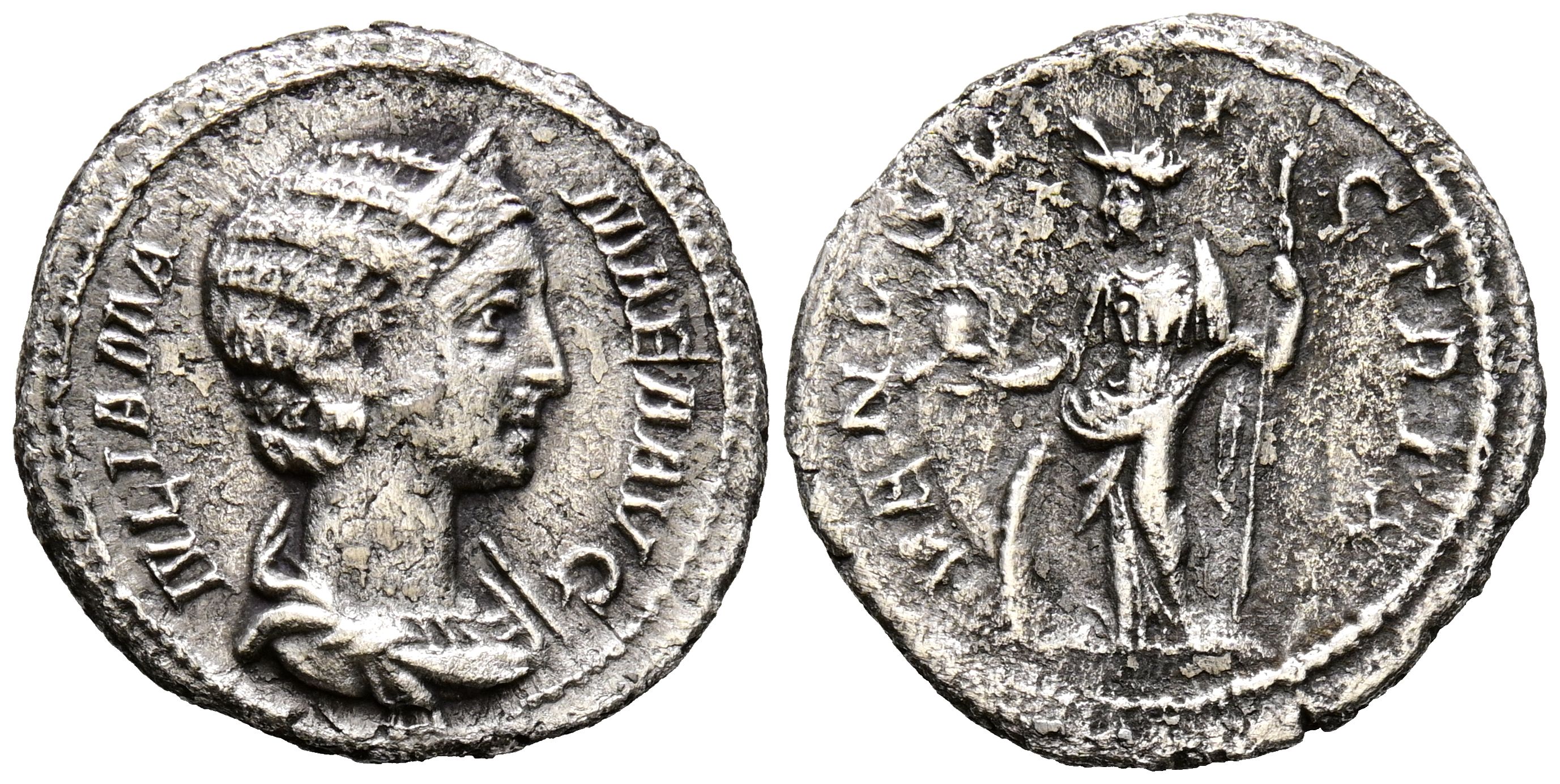 JULIA MAMEA. Denario. (Ar. 2,62g/19mm). 231 d.C. (RIC 358). Anv: Busto diademado y drapeado de Julia Mamea a derecha, alrededor leyenda: IVLIA MAMAEA AVG. Rev: Venus estante a izquierda con casco y cetro, a sus pies un escudo, alrededor leyenda: VENVS VICTRIX. MBC-.