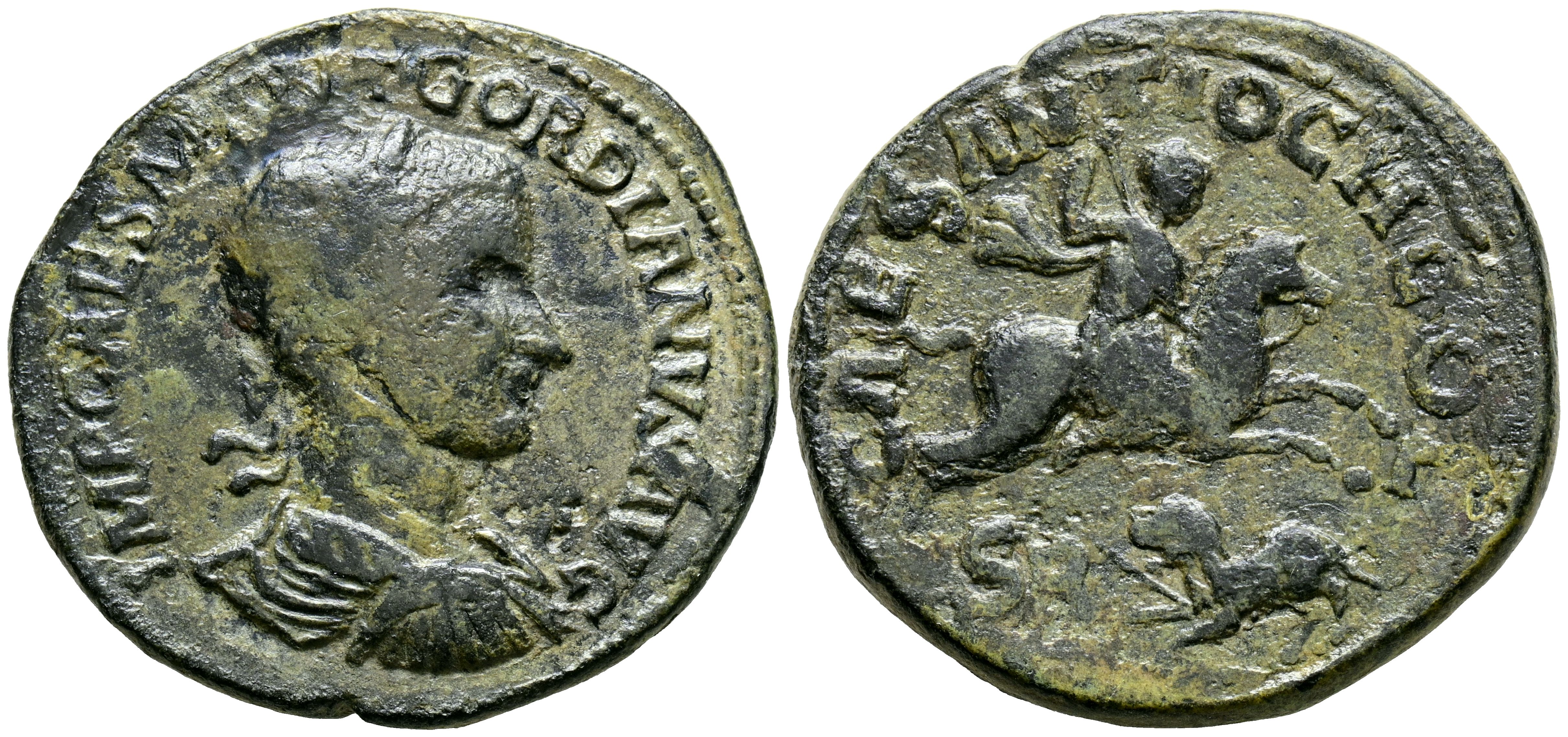 GORDIANO III. Ae 33. (Ae. 20,33g/33mm). 238-244 d.C. Pisidia, Antioquía. (BMC 85). Anv: Busto laureado, drapeado y con coraza de Gordiano a derecha, alrededor leyenda: IMP CAES M ANT GORDIANVS AVG. Rev: Emperador galopando a caballo a derecha, sosteniendo riedas y apuntando con lanza a un león que está debajo. Alrededor leyenda: CAES ANTIOCH COL. MBC.