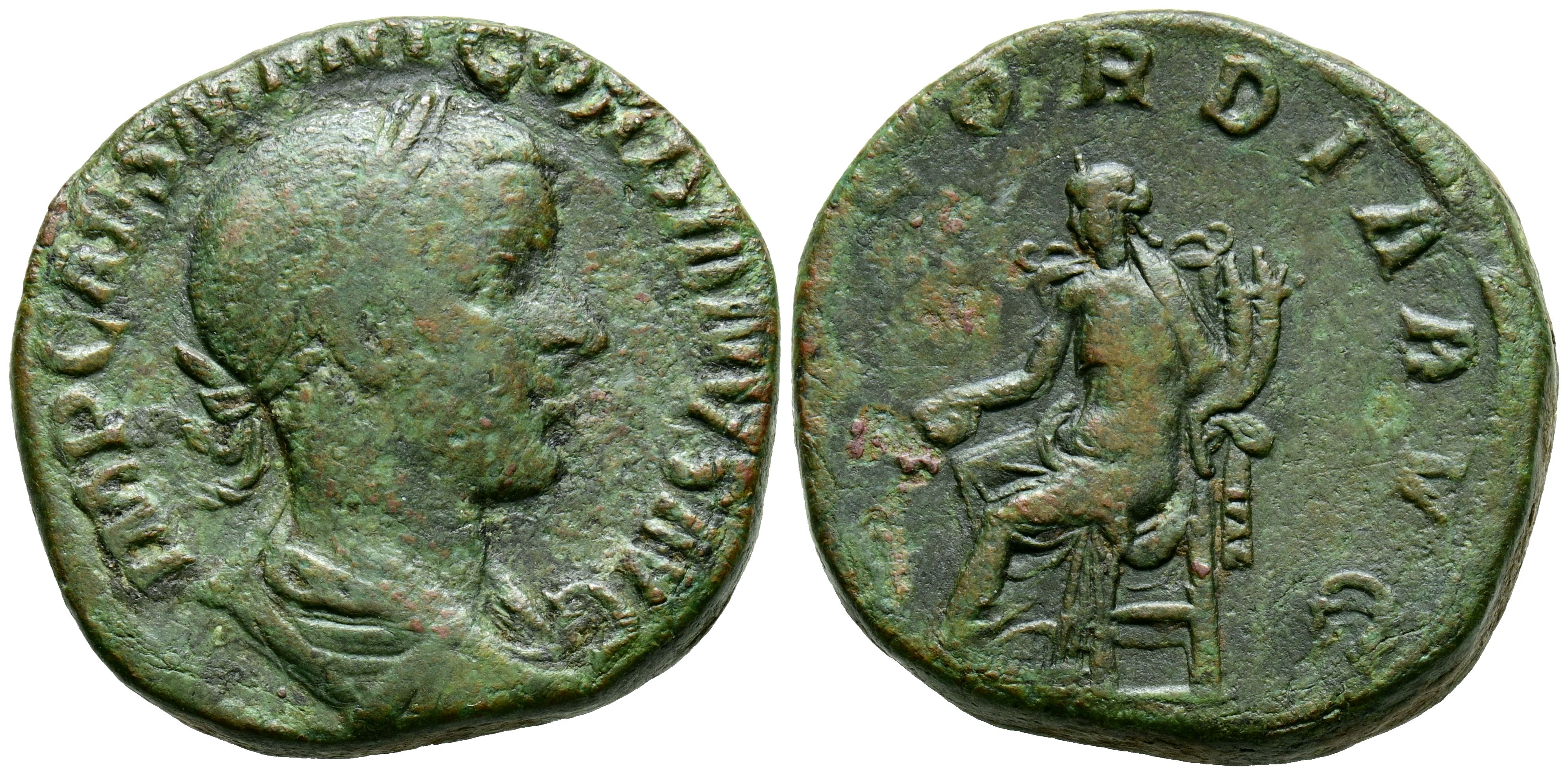 GORDIANO III. Sestercio. (Ae. 18,01g/28mm). 240 d.C. Roma. (RIC 268). Anv: Busto laureado y drapeado de Godiano III a derecha, alrededor leyenda: IMP CAES M ANT GORDIANVS AVG. Rev: Concordia sentada a derecha portando patera y doble cornucopia, en exergo: SC, alrededor leyenda: CONCORDIA AVG. MBC.