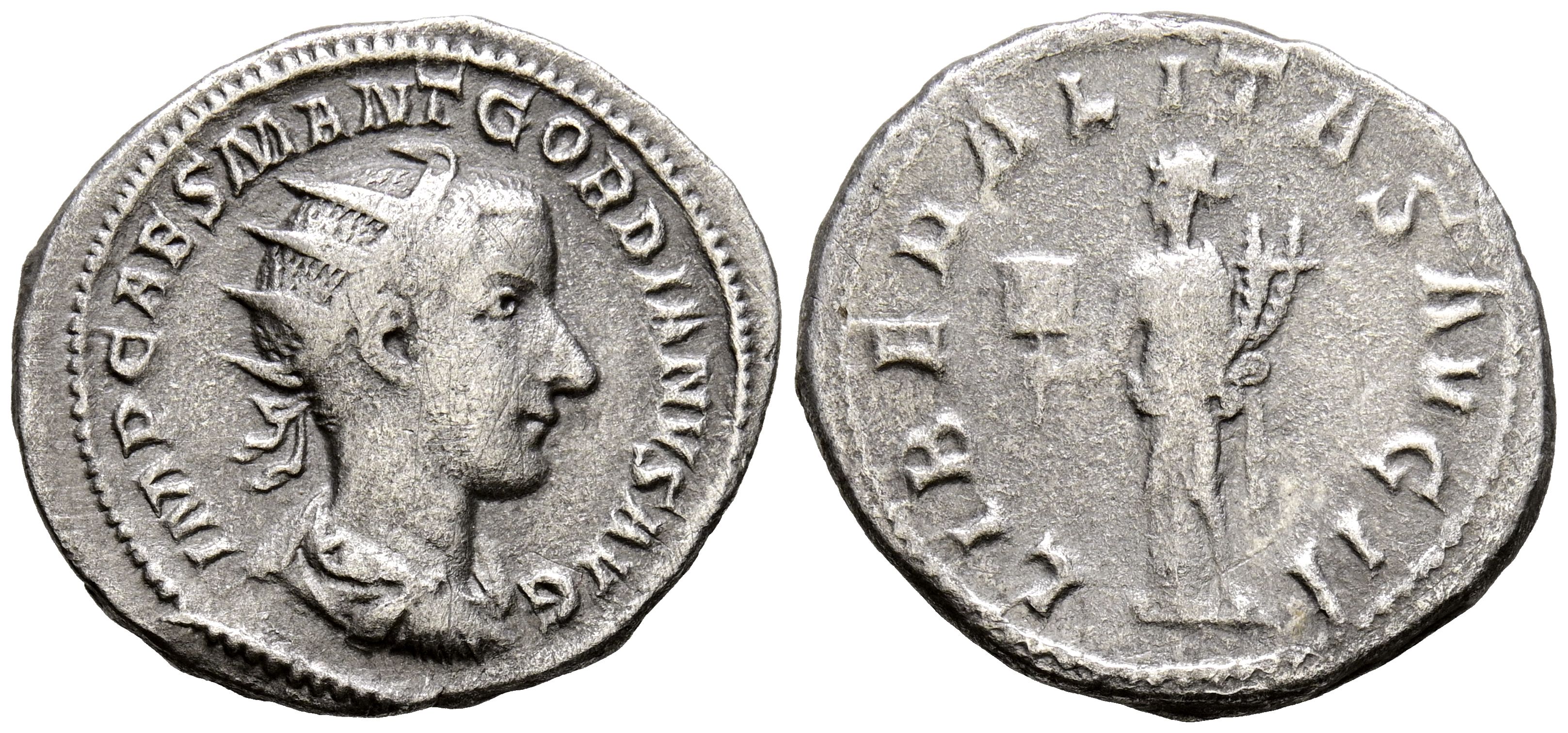 GORDIANO III. Antoniniano. (Ae. 4,14g/23mm). 240-241 d.C. Roma. (RIC 36). Anv: Busto radiado, drapeado y con coraza de Gordiano III derecha, alrededor leyenda: IMP CAES M ANT GORDIANVS AVG. Rev: Liberalitas estante a izquierda portando ábaco y cornucopia, alrededor leyenda: LIBERALITAS AVG II. MBC.