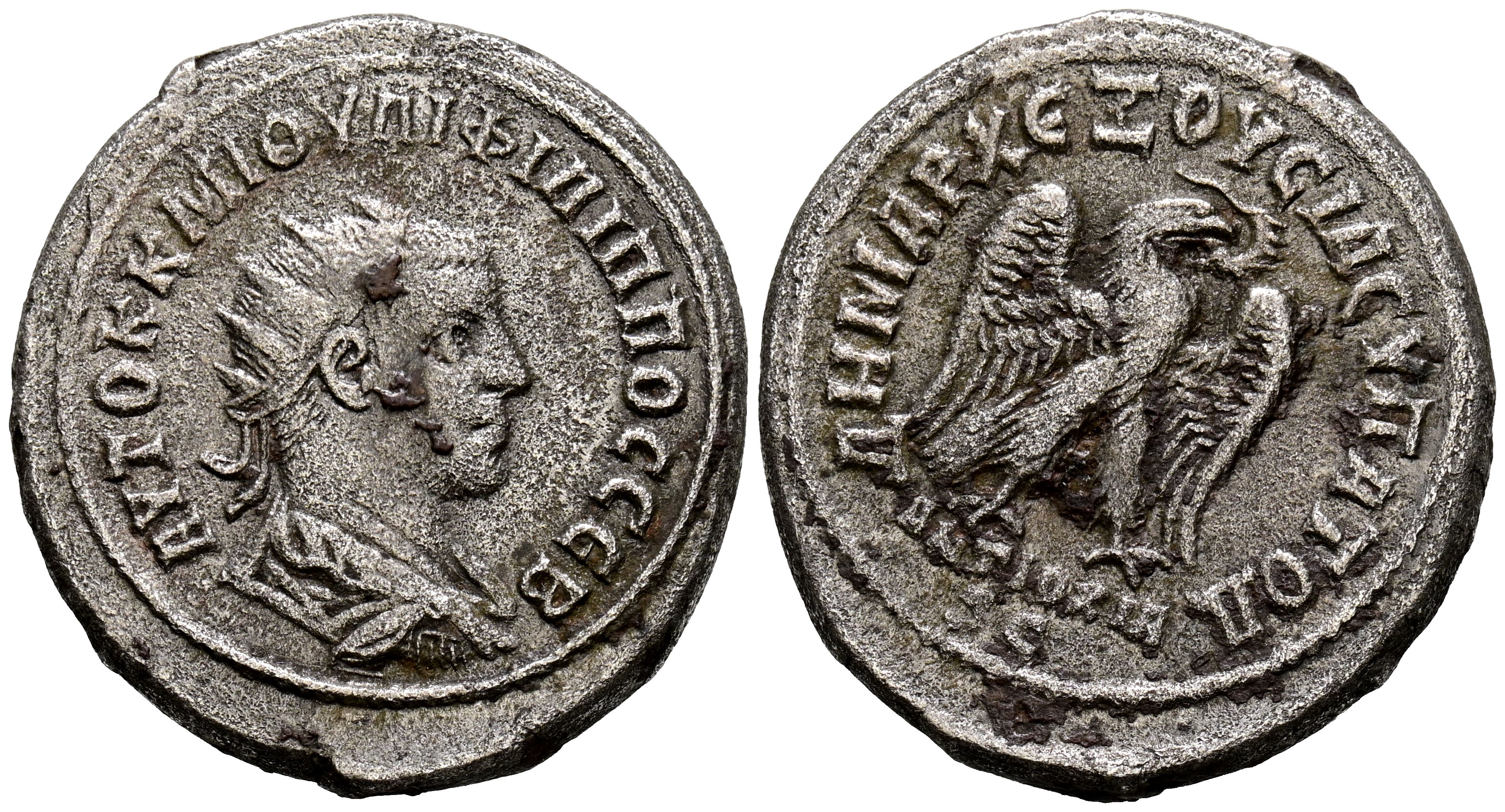 FILIPO I. Tetradracma. (Ar. 10,99g/28mm). 248 d.C. Seleucis y Pieria, Antioquía. (Prieur 368). Anv: Busto radiado y drapeado de Filipo I a derecha, alrededor leyenda: AYTOK K MIOYΛI ΦIΛIΠΠOC CEB. Rev: Águila en pie a izquierda sobre rayo con corona de laurel en el pico, en exergo: ANTIOXIA SC, alrededor leyenda: ΔHMAPX ΕΞOYCIAC YΠATOΓ. MBC. Oxidaciones.