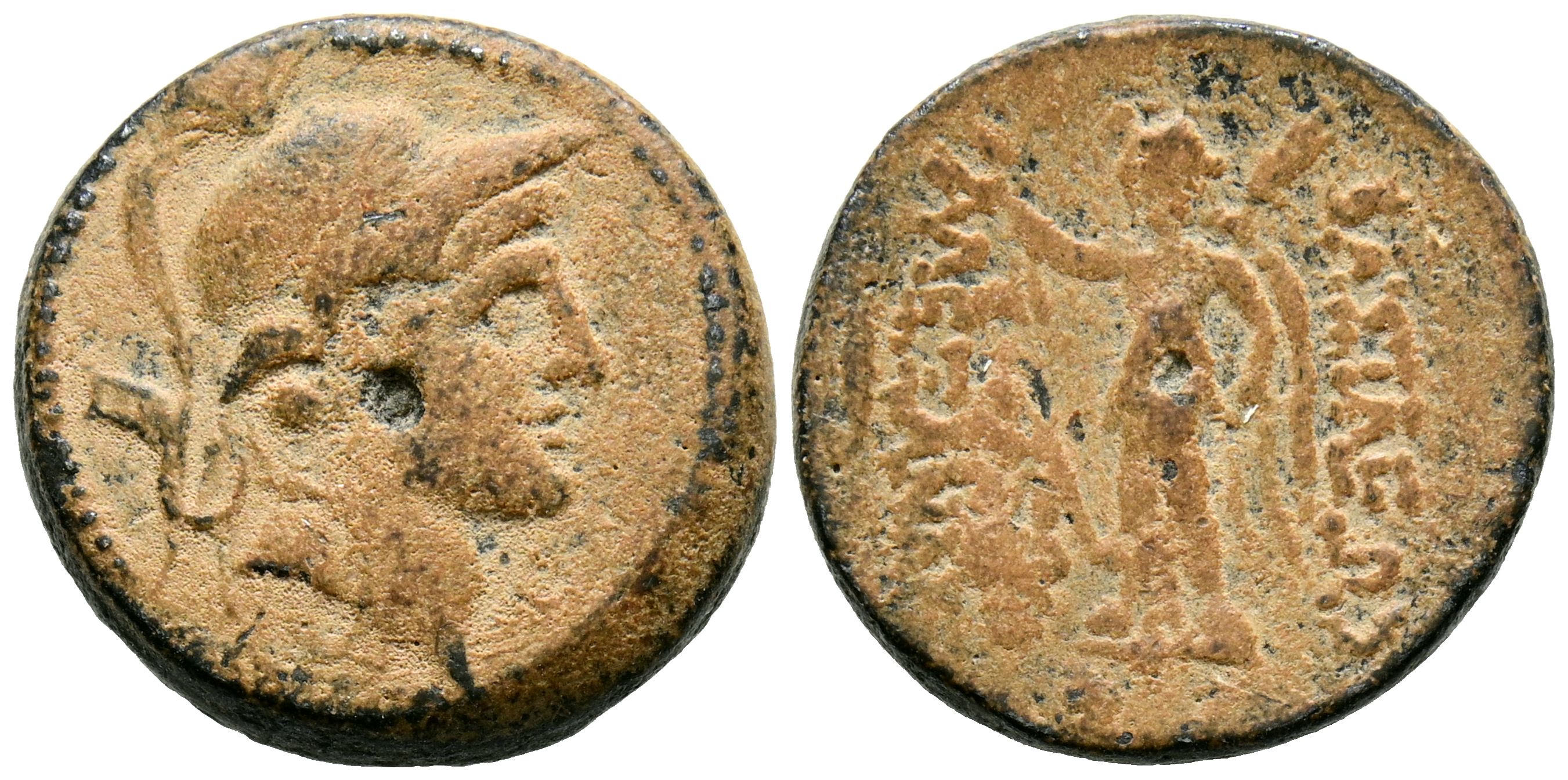 REINO SELEUCIDA, Alejandro I Balas. Ae19. (Ae. 5,78g/19mm). 152-145 a. C. Antioquía. (Seaby 1790). Anv: Cabeza de Atenas a la derecha. Rev: Nike de pie a la izquierda, sosteniendo una corona y una hoja de palma sobre el hombro; monograma en el interi or izquierdo y en la parte inferior, delante y detrás leyenda: BAΣΙΛΕΩΣ AΛEΞANΔPOY. MBC