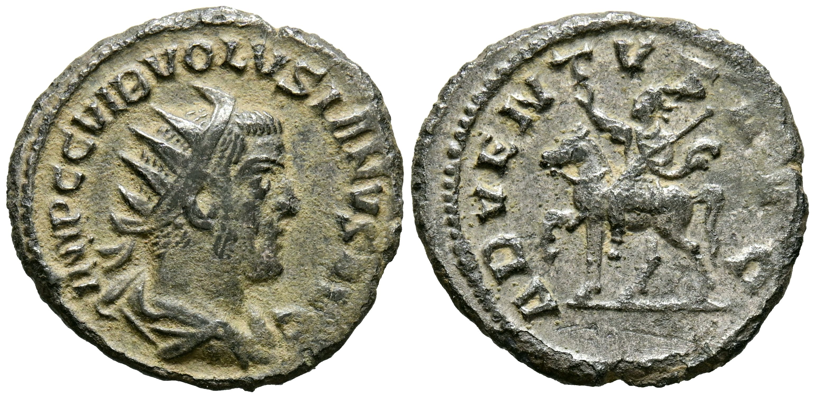 VOLUSIANO. Antoniniano. (Ve. 2,76g/21mm). 251-253 d.C. Antioquía. (RIC 214). Anv: Busto radiado y drapeado de Volusiano a derecha, alrededor leyenda: IMP C C VIB VOLVSIANVS AVG. Rev: Volusiano a caballo con lanza a izquierda, alrededor leyenda: ADVENTVS AVG. MBC.
