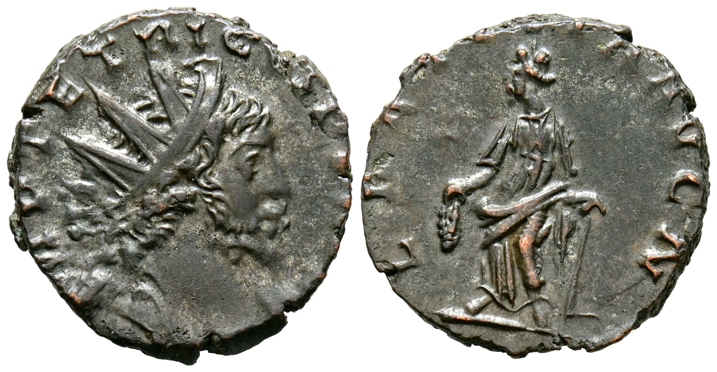 TÉTRICO I. Antoniniano. (Ae. 2,57g/17mm). 272 d.C. Colonia Agrippinensis. (RIC 90). Anv: Busto radiado y con coraza de Tétrico I a derecha, alrededor leyenda: IMP TETRICVS P F AVG. Rev: Laetitia de pie a izquierda, sosteniendo una corona y un bastón o ancla, alrededor leyenda: LAETITIA AVG N. EBC.