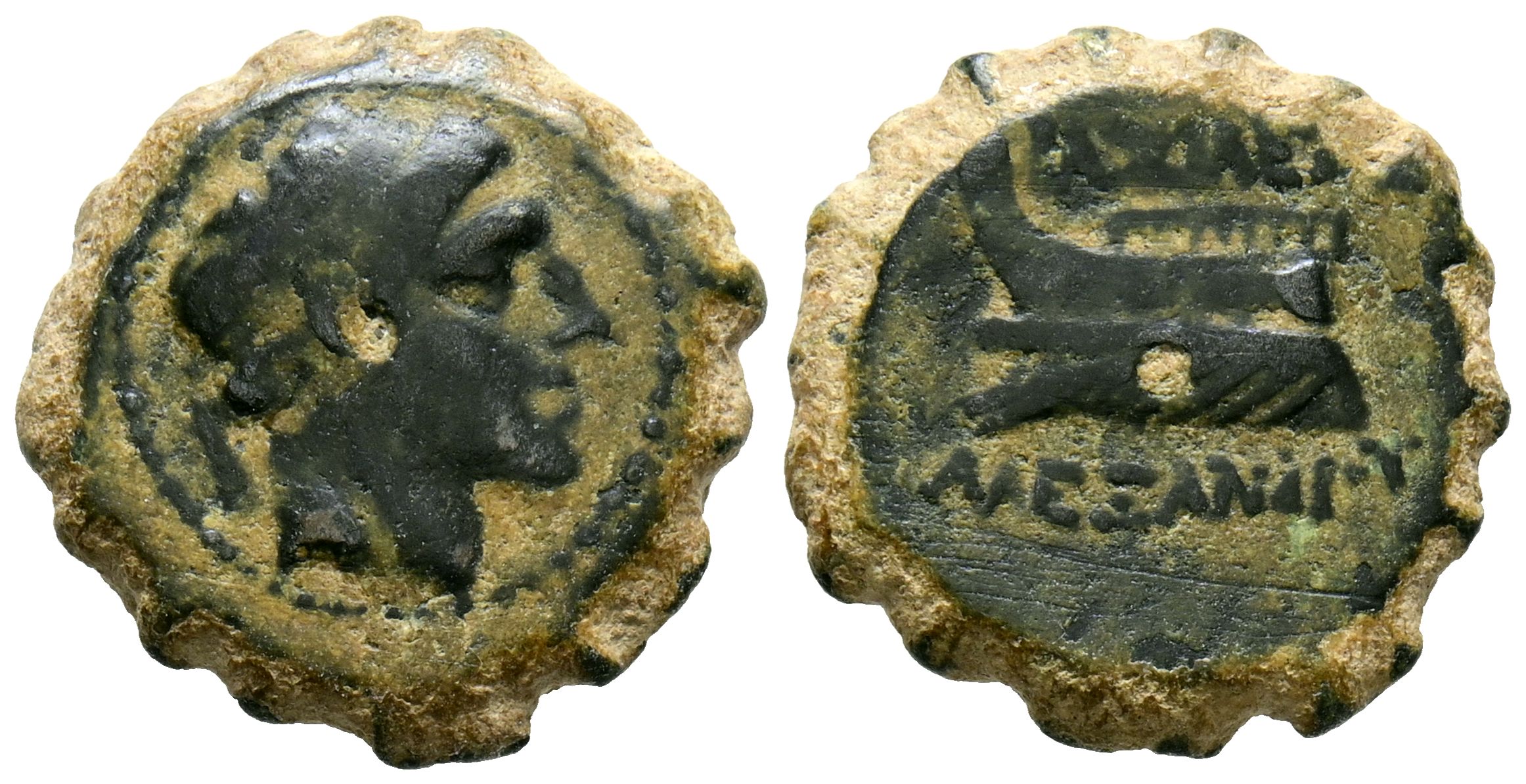 REYES SELEUCIDAS, Alejandro I Balas. Ae16. (Ae. 3,81g/16mm). 152-145 a. C. Ceca incierta del norte de Siria. (Seaby 1814). Anv: Busto coronado y drapeado de Alejandro I a la derecha. Rev: Proa de la galera a la izquierda, monograma arriba, alrededor leyenda: BAΣIΛEΩΣ/AΛEΞANΔPOY. MBC.