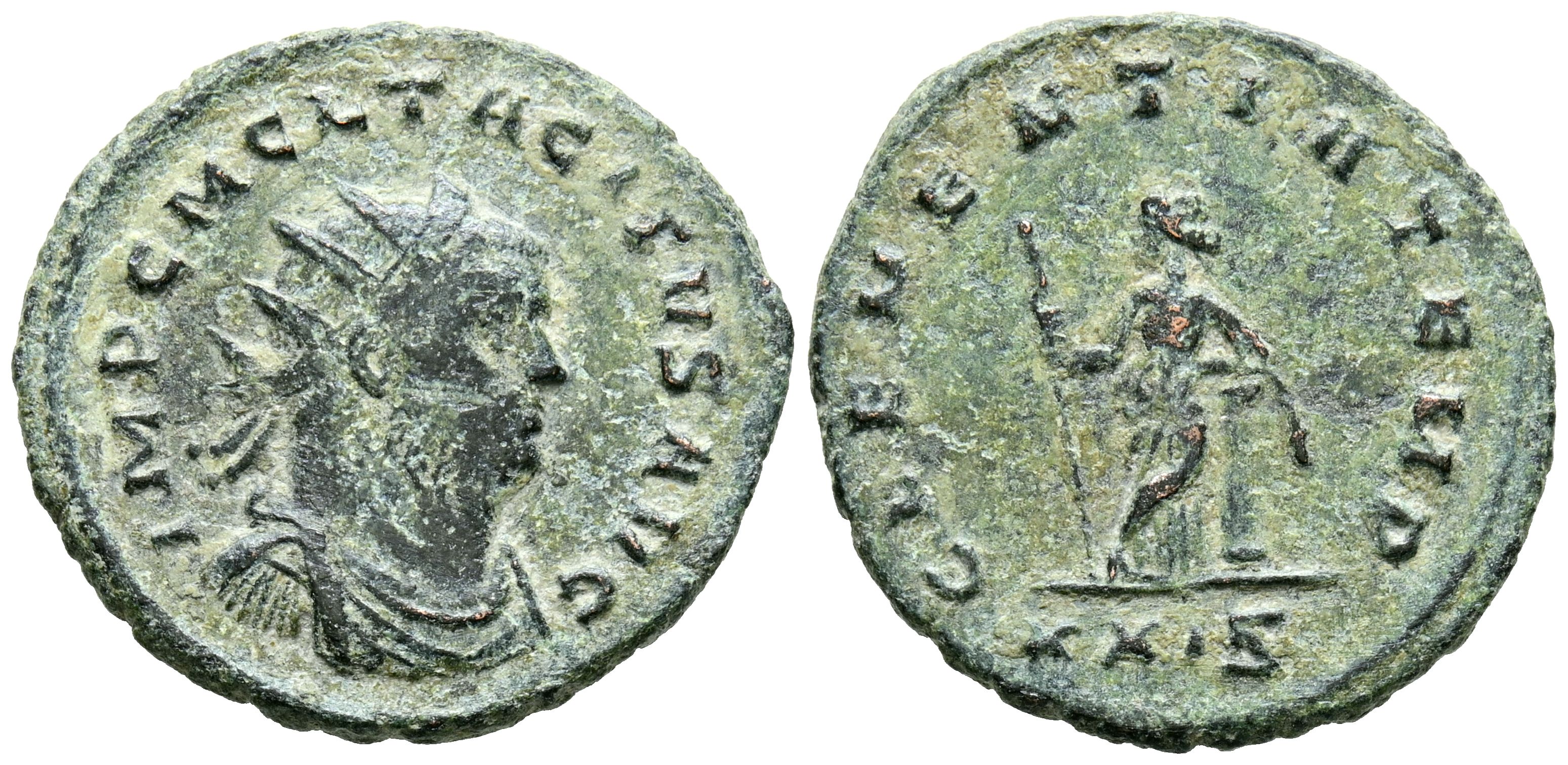 TACITO. Antoniniano. (Ae. 3,64g/21mm). 275-276. Roma. (RIC 84). Anv: Busto radiado y drapeado de Tácito a derecha, alredor leyenda: IMP C M CL TACITVS AVG. Rev: Clementia estante acodada en columna con cetro, alrededor leyenda: CLEMENTIA TEMP, en exergo: XXIZ. MBC.