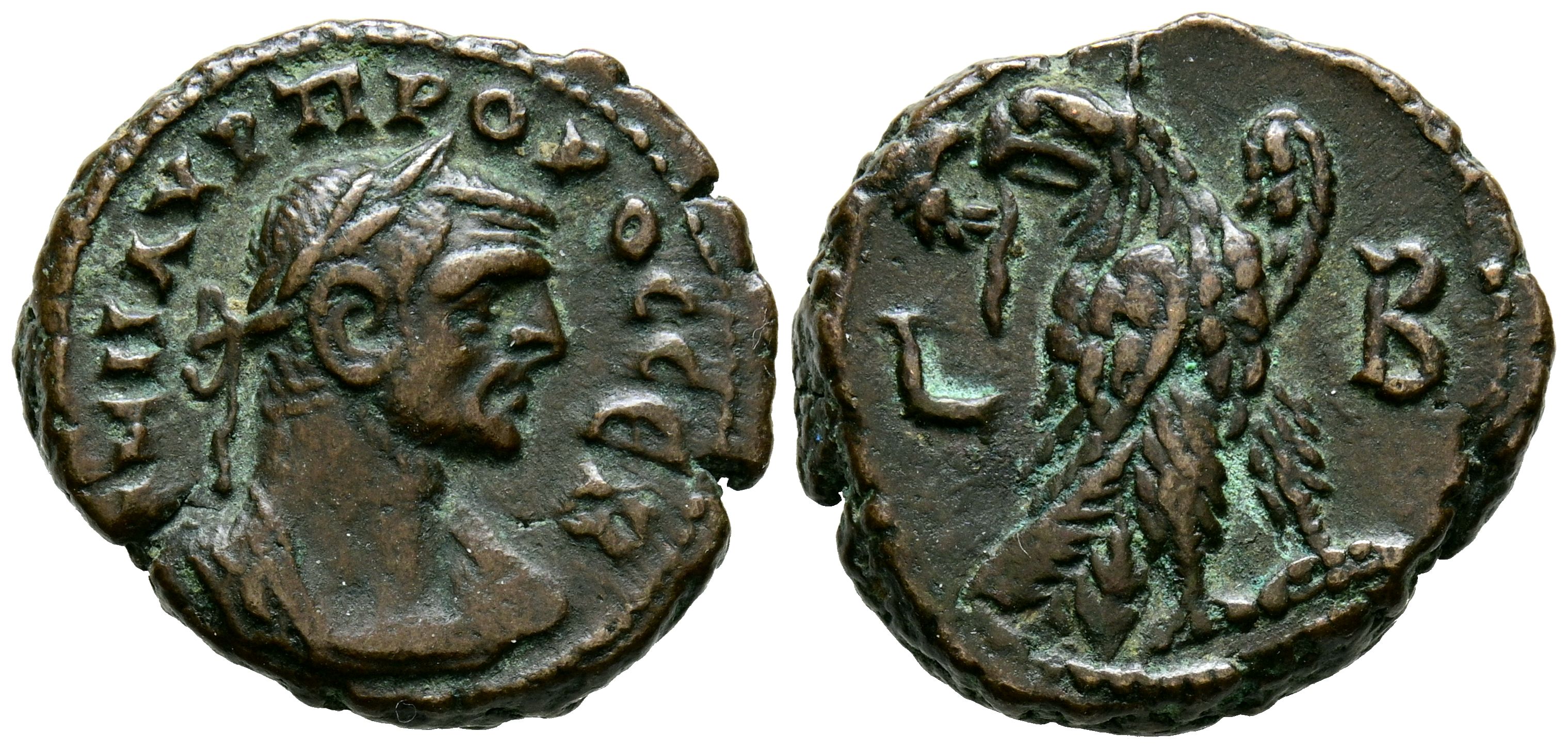PROBO. Tetradracma. (Ae. 7,30g/21mm). 276-277 d.C. Alejandría. (Emmett 3983). Anv: Busto laureado y con coraza de Probo a derecha, alrededor leyenda: A K M AVP ΠΡOBOC CЄB. Rev: Aguila estante a izquierda portando corona de laurel, entre L-B. MBC+.