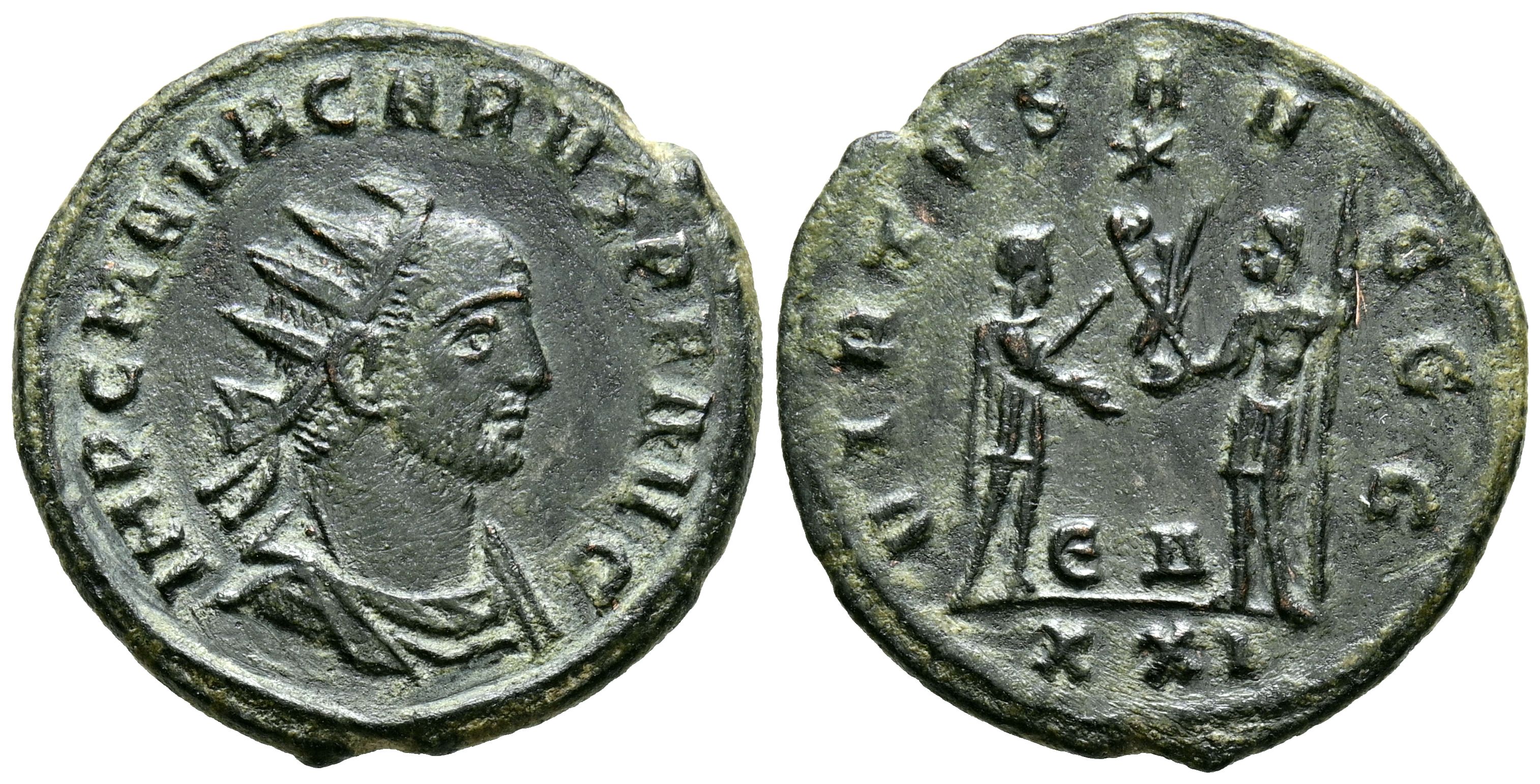 CARO. Antoniniano. (Ae. 3,62g/21mm). 282 d.C. Antioquía. (RIC 125). Anv: Busto radiado, drapeado y con coraza de Caro a derecha, alrededor leyenda: IMP C M AVR CARVS P F AVG. Rev: Caro estante a izquierda portando cetro recibiendo Victoria de Júpiter estante a derecha, encima estrella, entre ellos: EA, en exergo: XXI, alrededor leyenda: VIRTVS AVGG. MBC.