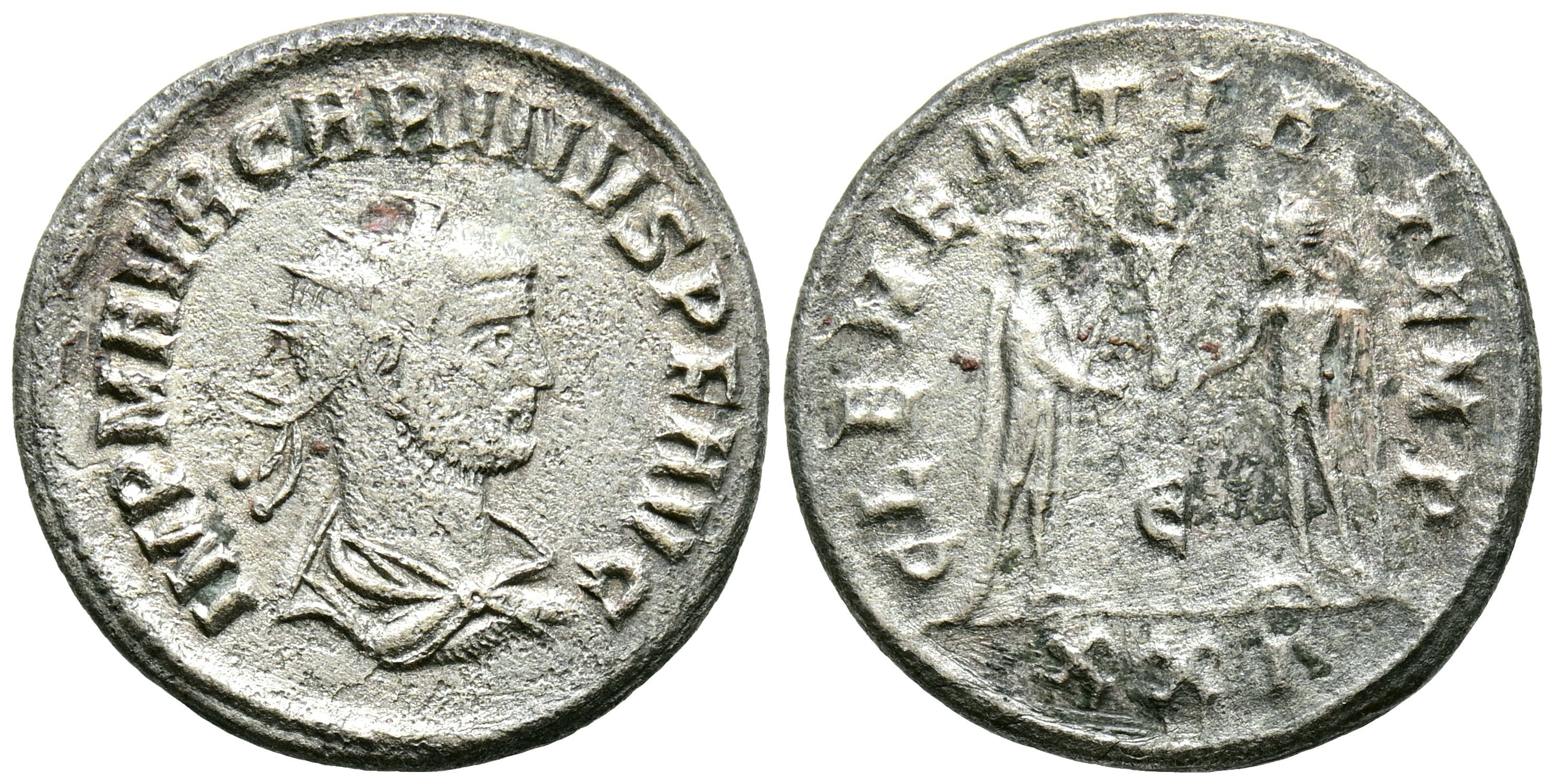 CARINO. Antoniniano. (Ae. 3,54g/21mm). 283-285 d.C. Cícico. (RIC 234). Anv: Busto radiado y drapeado de Carino a derecha, alrededor leyenda: IMP M AVR CARINVS P F AVG. Rev: Carino estante a derecha recibiendo Victoria de Júpiter estante a izquierda portando cetro, entre ellos E, en exergo: XXI, alrededor leyenda: CLEMENTIA TEMP. MBC. Restos de plateado original.