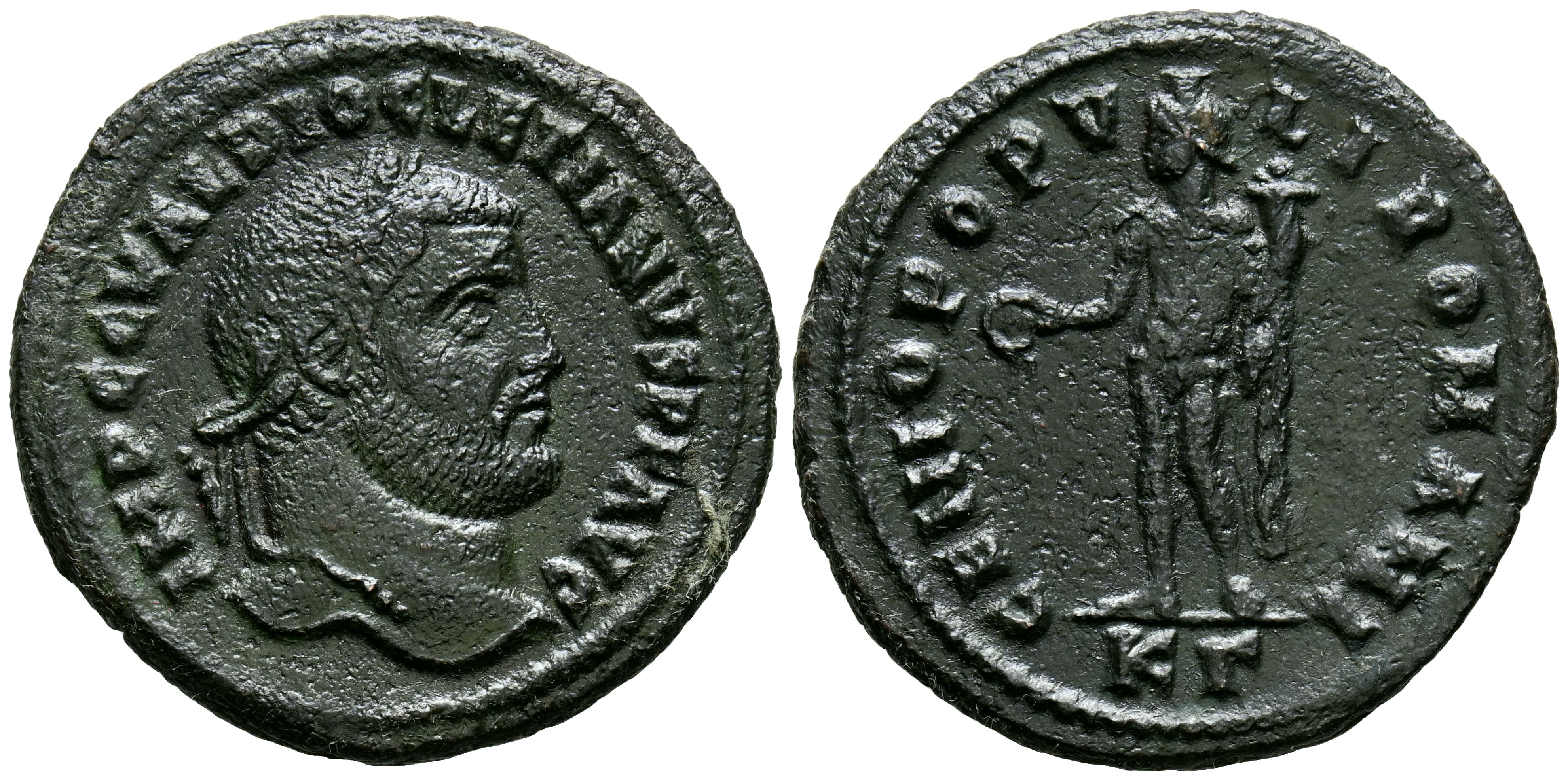 DIOCLECIANO. Follis. (Ae. 8,21g/28mm). 295-196 d.C. Cícico. (RIC 12a). Anv: Busto laureado de Diocleciano a derecha, alrededor leyenda: IMP C C VAL DIOCLETIANVS P F AVG. Rev: Genio estante a izquierda portando patera y cornucopia, en exergo: KΓ, alre dedor leyenda: GENIO POPVLI ROMANI. MBC.