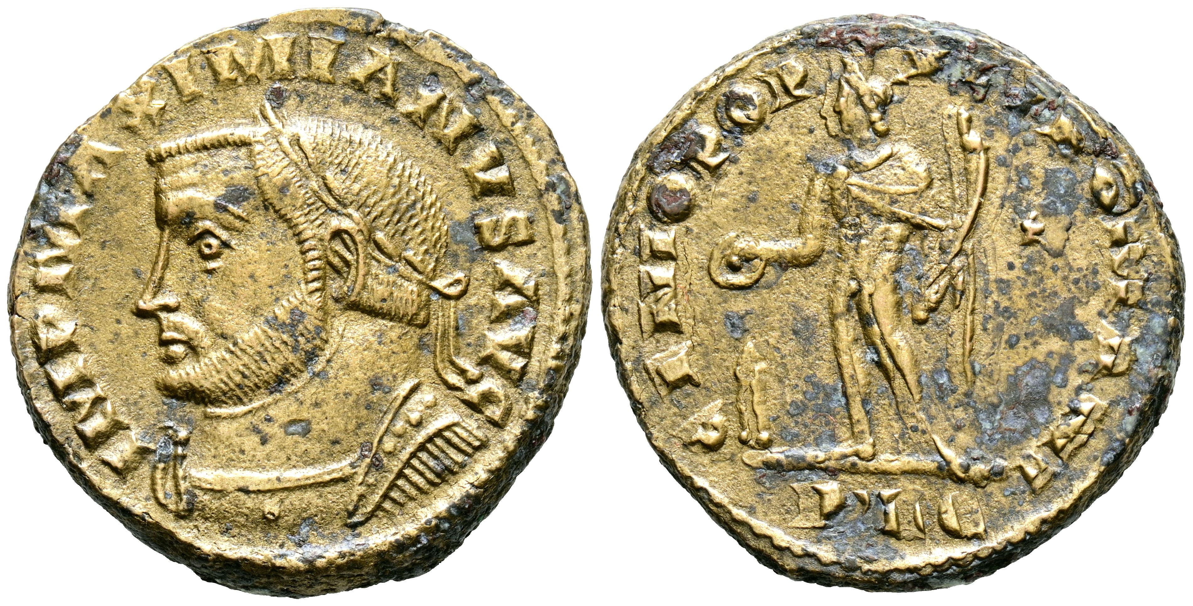 MAXIMIANO. Follis. (Ae. 11,14g/27mm). 286-305 d.C. Lugdunum. (RIC 187b). Anv: Busto laureado y con coraza a izquierda, alrededor leyenda: IMP MAXIMIANVS AVG. Rev: Genio a izquierda con modio en la cabeza, portando pátera y cornucopia, altar a izquierda, estrella en el campo derecho, en exergo: PLC, alrededor leyenda: GENIO POPVLI ROMANI. MBC. Repinte en reverso.