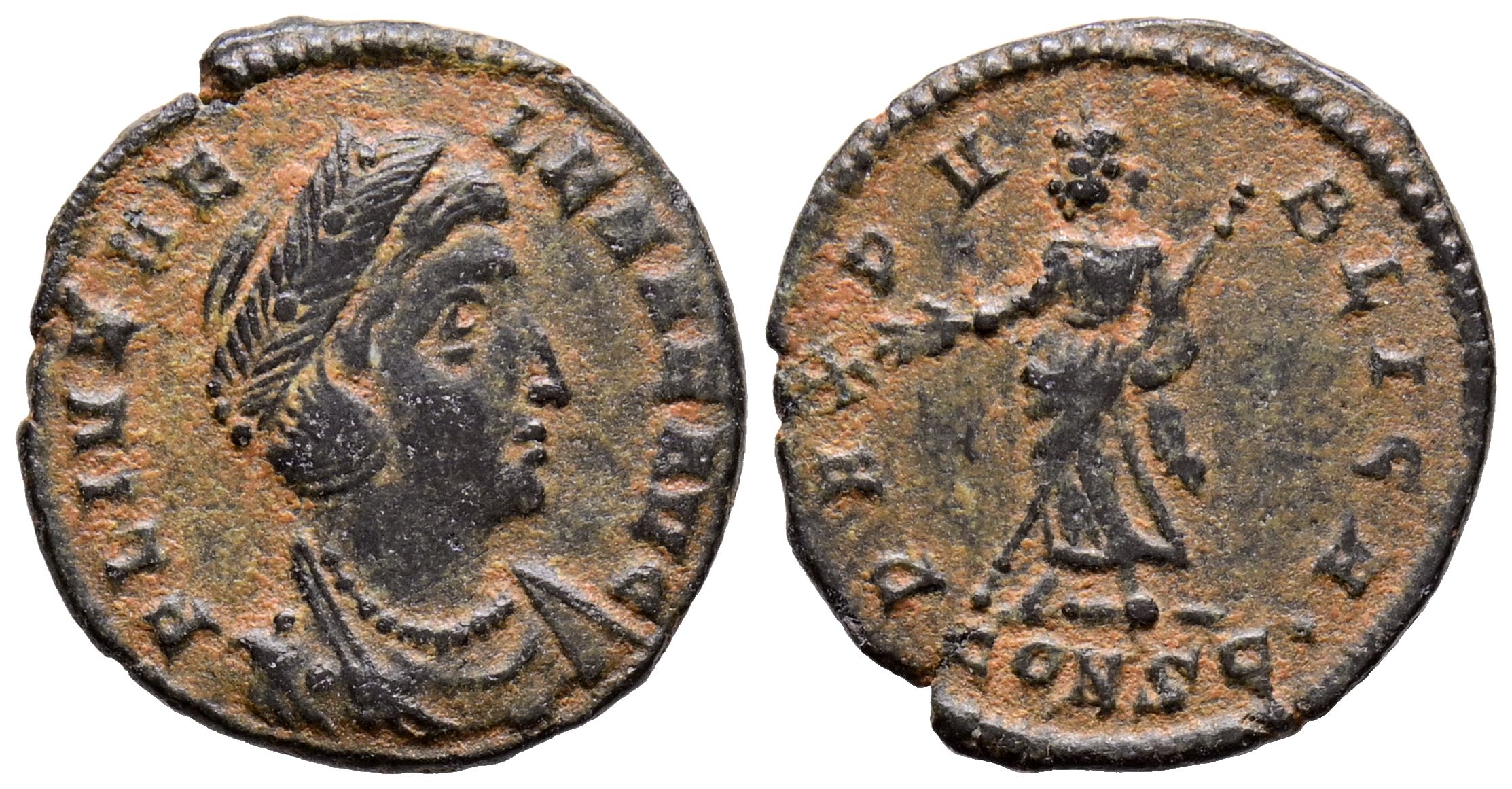 HELENA. Follis. (Ae. 1,56g/17mm). 330 d.C. Constantinopla. (RIC 33). Anv: Busto diademado, drapeado y con coraza de Helena a derecha, alrededor leyenda: FL IVL HELENAE AVG. Rev: Pax estante a izquierda portando rama y cetro, en exergo: CONSE, alrededor leyenda: PAX PVBLICA. MBC+.