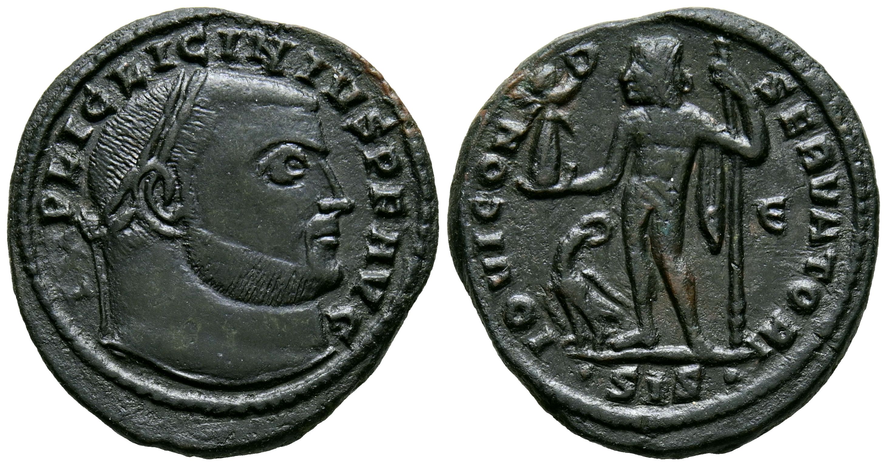 LICINIO I. Follis. (Ae. 3,97g/21mm). 313-315 d.C. Siscia. (RIC 7). Anv: Cabeza laureada de Licinio I a dercha, alrededor leyenda: IMP LIC LICINIVS P F AVG. Rev: Júìter estante a izquierda portando cetro y Victoria con corona de laurel, en exergo: SIS, en campo E, alrededor leyenda: IOVI CONSERVATORI. MBC+.