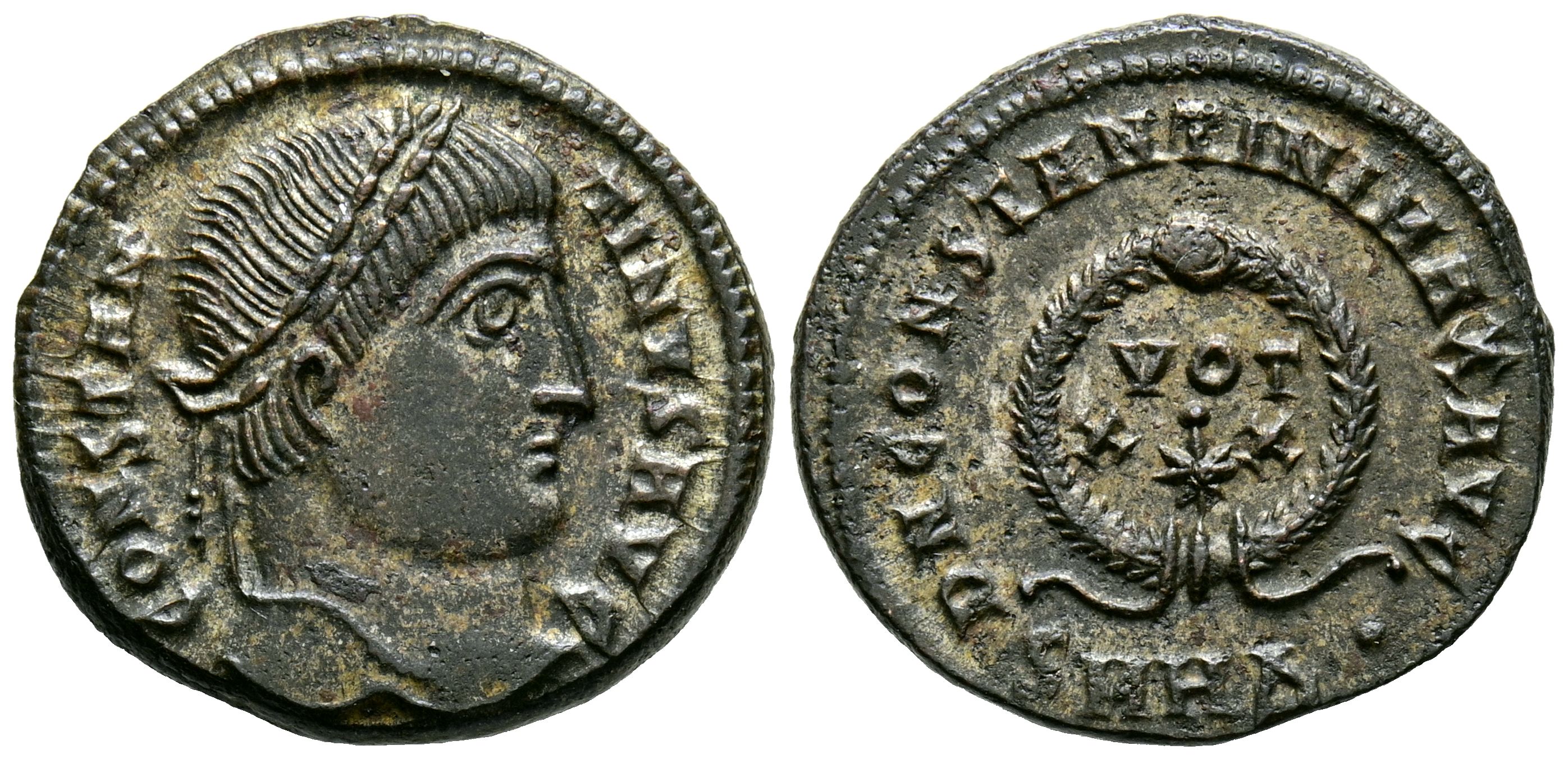 CONSTANTINO I. Follis. (Ae. 3,49g/19mm). 324 d.C. Heraclea. (RIC 64). Anv: Cabeza laureada de Constantino I a derecha, alrededor leyenda: CONSTANTINVS AVG. Rev: Leyenda: VOT/XX, dentro de corona de laurel, debajo: SMHA, alrededor leyenda: DN CONSTANTINI MAX AVG. EBC.