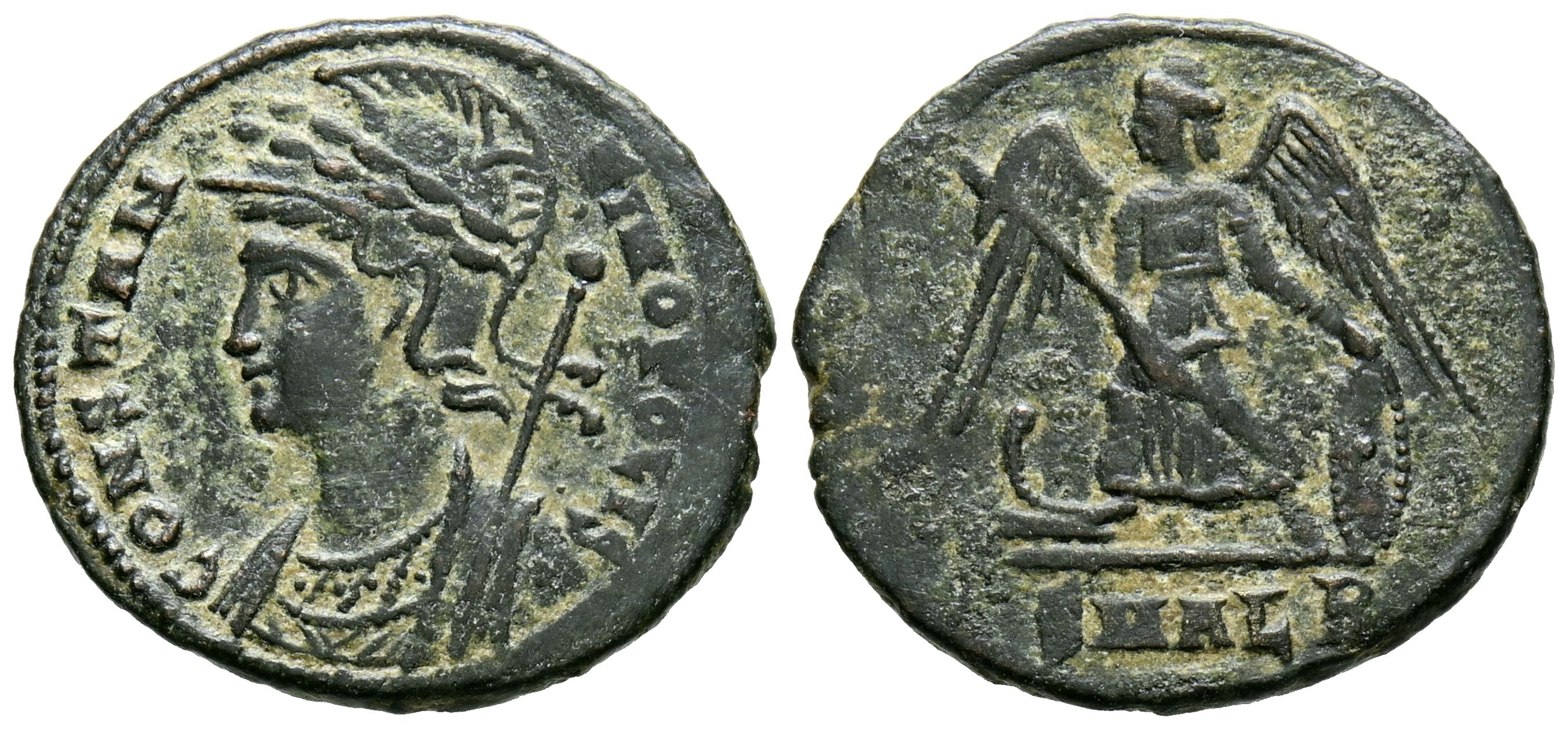 CONSTANTINO I. Serie conmemorativa. Follis. (Ae. 2,24g/19mm). 335-337 d.C. Alejandría. (RIC 71). Anv: Busto laureado con casco y manto de Constantinopla sosteniendo cetro, alrededor leyenda: CONSTANTINOPOLIS. Rev: Victoria estante a izquierda apoyando pie sobre proa, portando cetro y apoyándose sobre escudo, en exergo: SMALA. MBC.