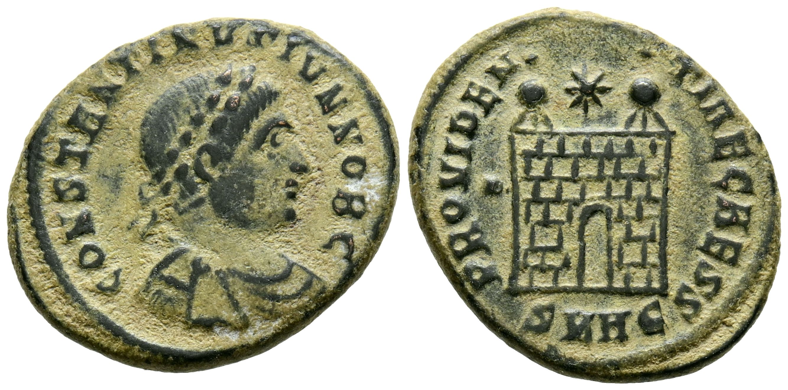 CONSTANTINO II. Follis. (Ar. 3,19g/20mm). 327-329 d.C. Heráclea. (RIC 96). Anv: Busto laureado de Constantino II a derecha, alrededor leyeneda: CONSTANTINVS IVN NOB C. Rev: Puerta de campamento con dos torretas encima, entre ellas estrella, al lado punto, en exergo: SMHE, alrededor leyenda: PROVIDENTIAE CAESS. MBC.