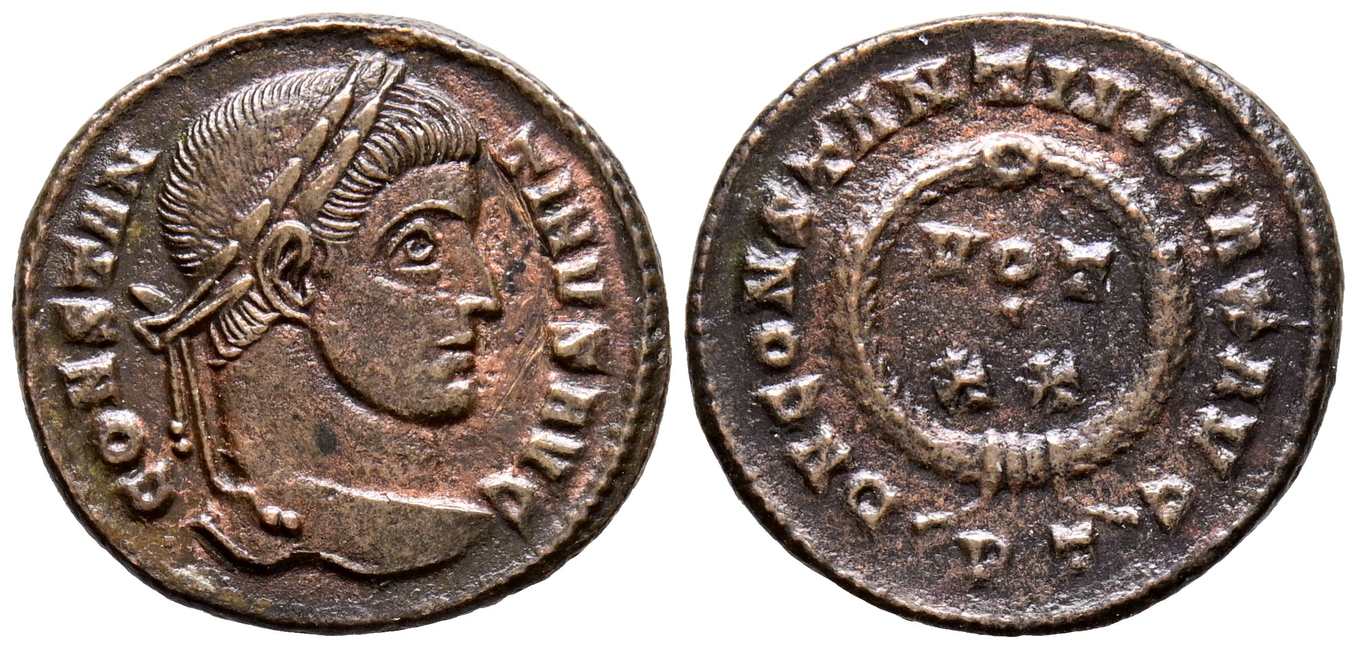 CONSTANTINO I. Follis. (Ae. 2,84g/18mm). 320-321 d.C. Ticinium. (RIC 140). Anv: Cabeza diademada de Constantino I a derecha, alrededor leyenda: CONSTANTINVS AVG. Rev: Leyenda: VOT/XX, dentro de corona de laurel, debajo: PT, alrededor leyenda: D N CONSTANTINI MAX AVG. MBC+.