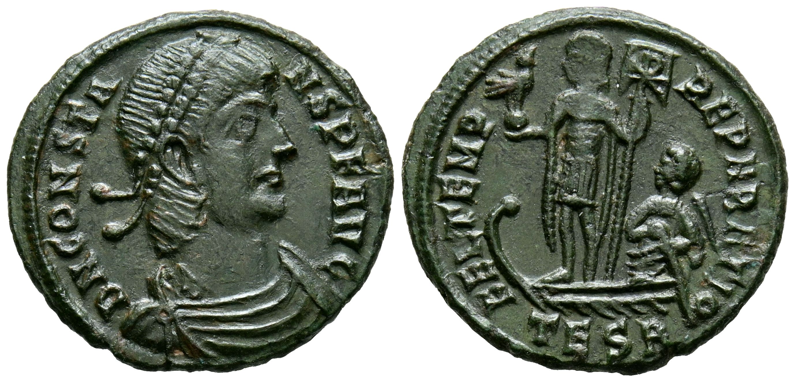 CONSTANTE. Follis. (Ae. 2,59g/18 mm). 276 d.C. Tesalónica. (RIC 109). Anv: Busto drapeado de Constante con diademas de perlas a derecha, alrededor leyenda: D N CONSTANS P F AVG. Rev: Constante estante a izquierda sobre proa sosteniendo fénix sobre globo y estandarte, en la popa, Victoria a los mandos del timón, en exergo: TESA, alrededor leyenda: FEL TEMP REPARATIO. EBC-. Bonito ejemplar.