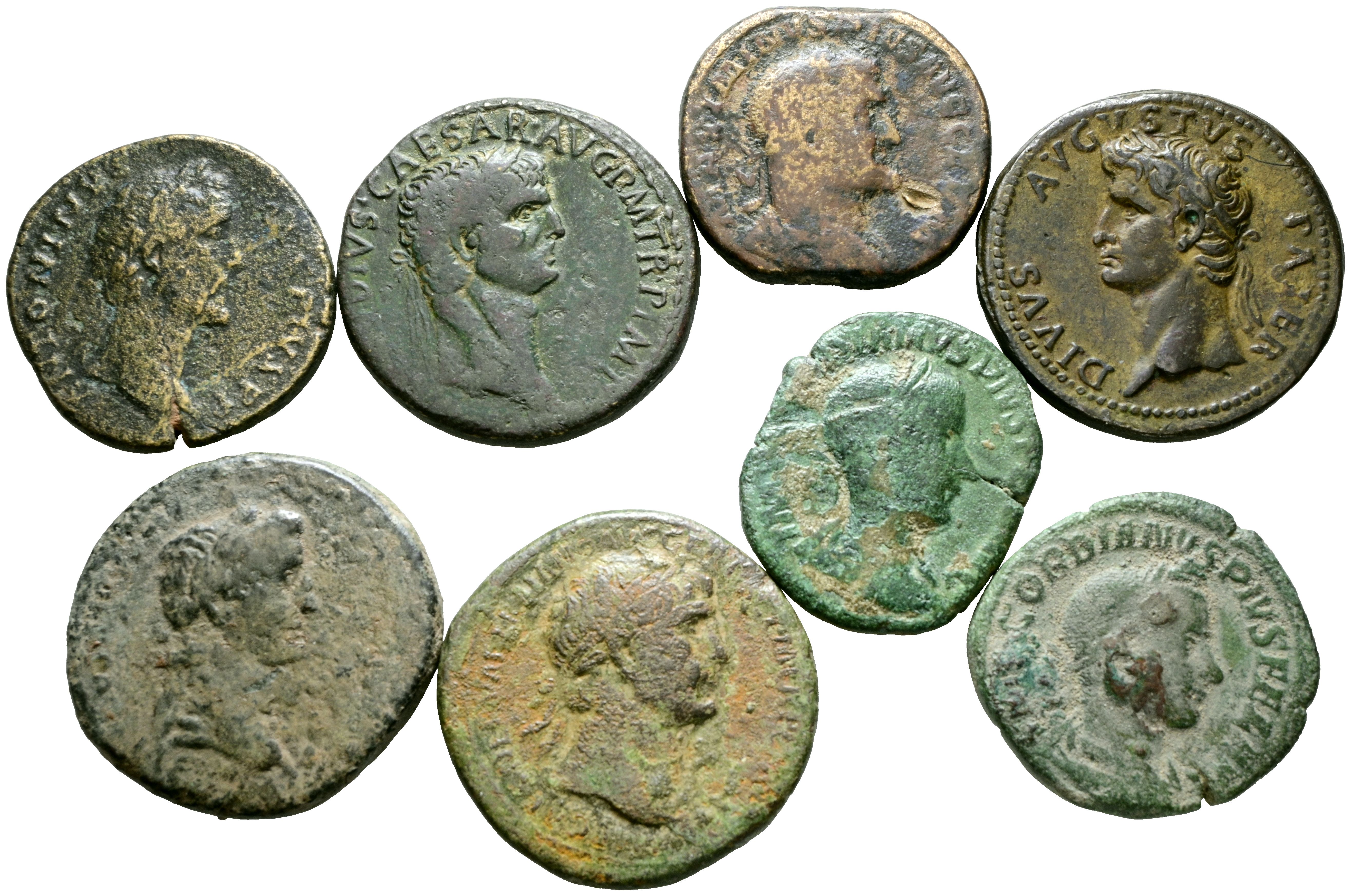 Interesante conjunto de 8 Sestercios de distintos emperadores romanos como Trajano, Augusto o Antonino Pío, entre ellos uno paduano. IMPRESCINDIBLE EXAMINAR.
