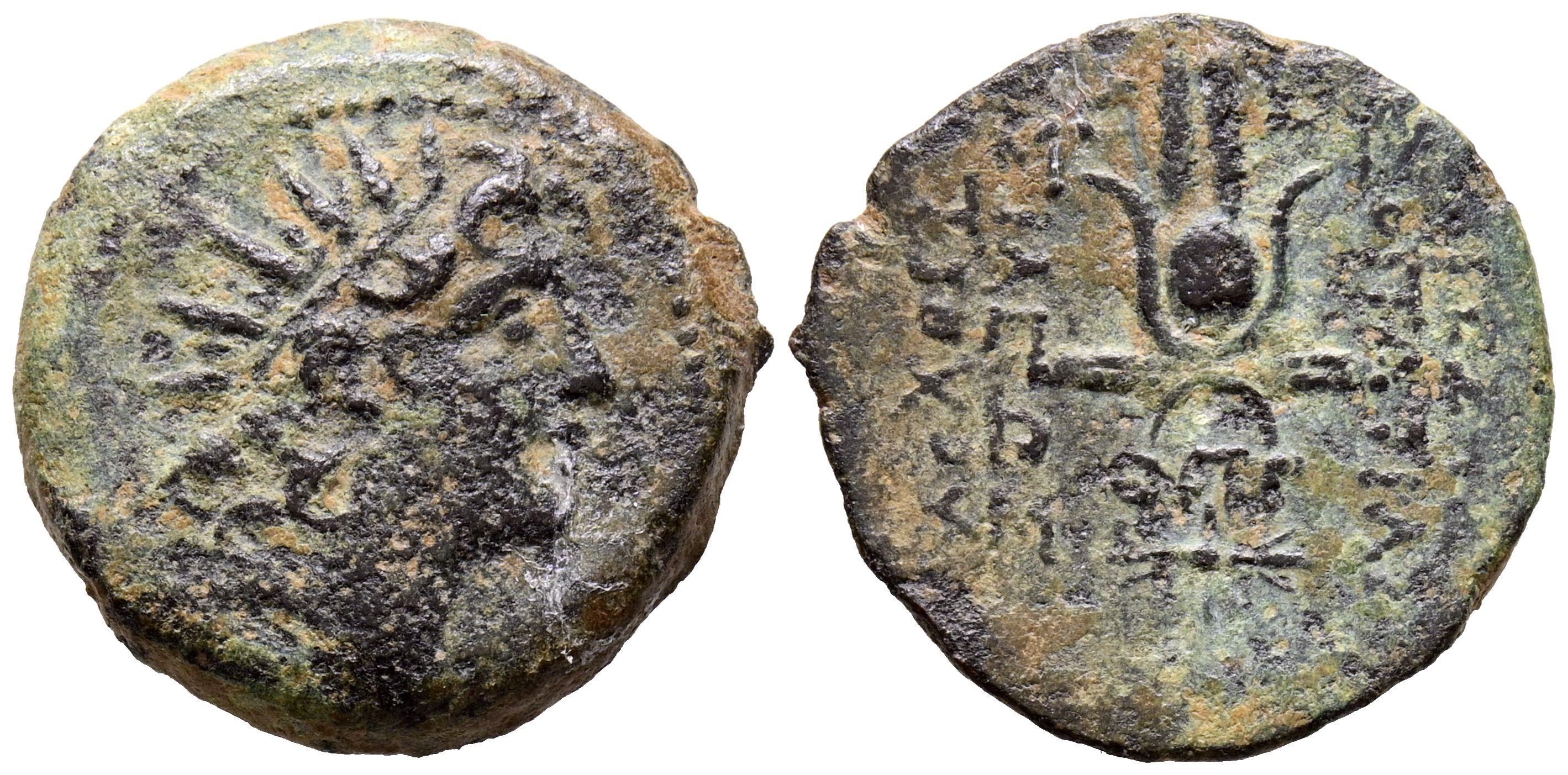REINO SELEUCIDA, Cleopatra Thea y Antiochos VIII. Ae18. (Ae. 4,12g/18mm). 125-121 a.C. (HGC 9, 1191). Anv: Busto masculino radiado a derecha. Rev: Tocado de Isis, alrededor leyenda: BAΣΙΛIΣΣHΣ KΛEOΠATPAΣ KAI BAΣΙΛΕΩΣ ANTIOXOY. MBC.or izquierdo y en l a parte inferior, delante y detrás leyenda: BAΣΙΛΕΩΣ AΛEΞANΔPOY. MBC