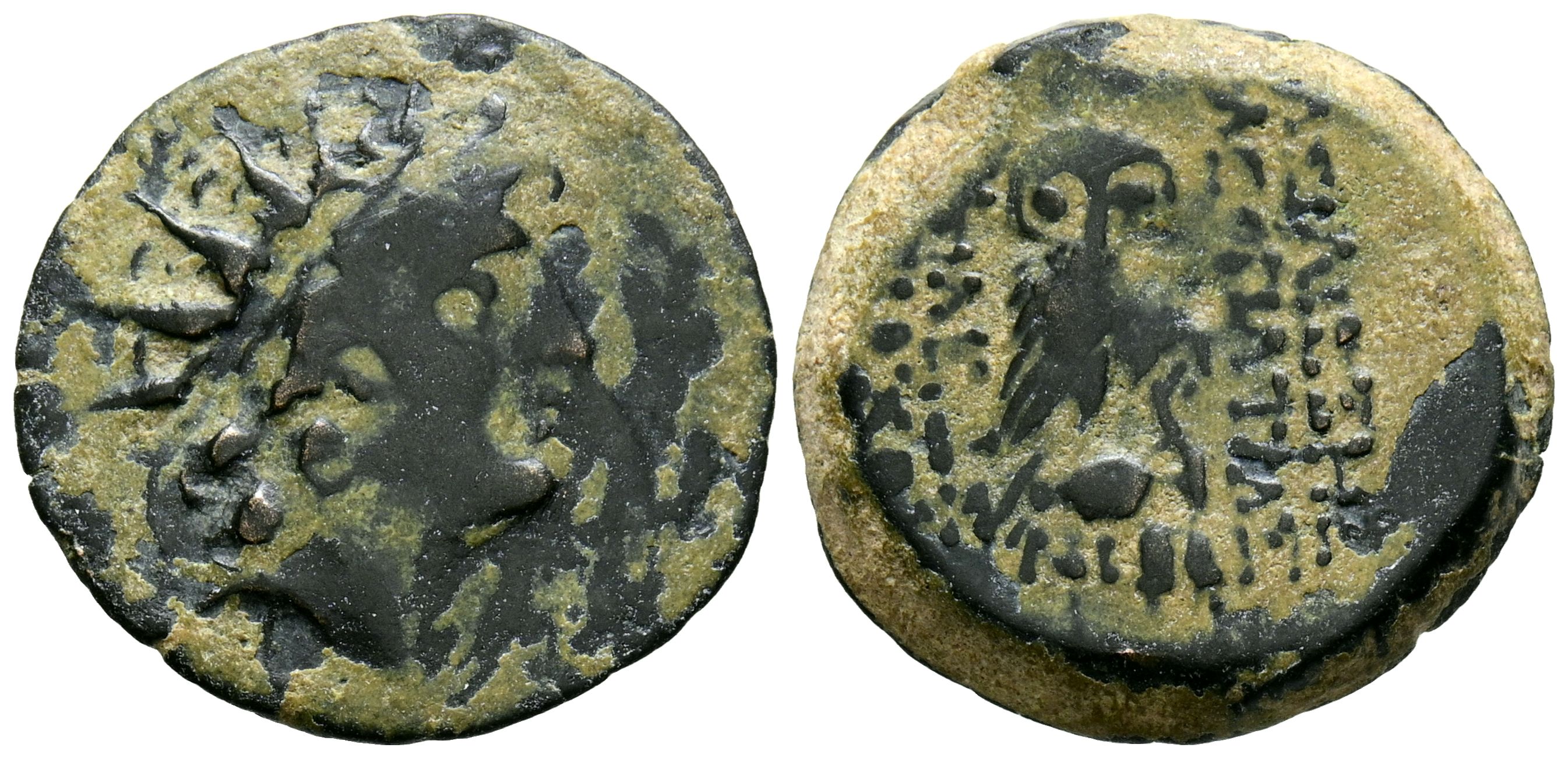REINO SELEUCIDA, Cleopatra Thea y Seleucos VII. Ae18. (Ae. 5,49g/18mm). 125-121 a.C. Antioquía. (SNG Spaer 2441-2460). Anv: Cabeza radiada de Antiocos VII a derecha. Rev: Búho sobre ánfora a derecha, alrededor leyenda griega: BAΣIΛIΣΣHΣ KΛEOΠATΡAΣ KA I BAΣIΛEΩΣ ANTIOXOΥ. MBC.