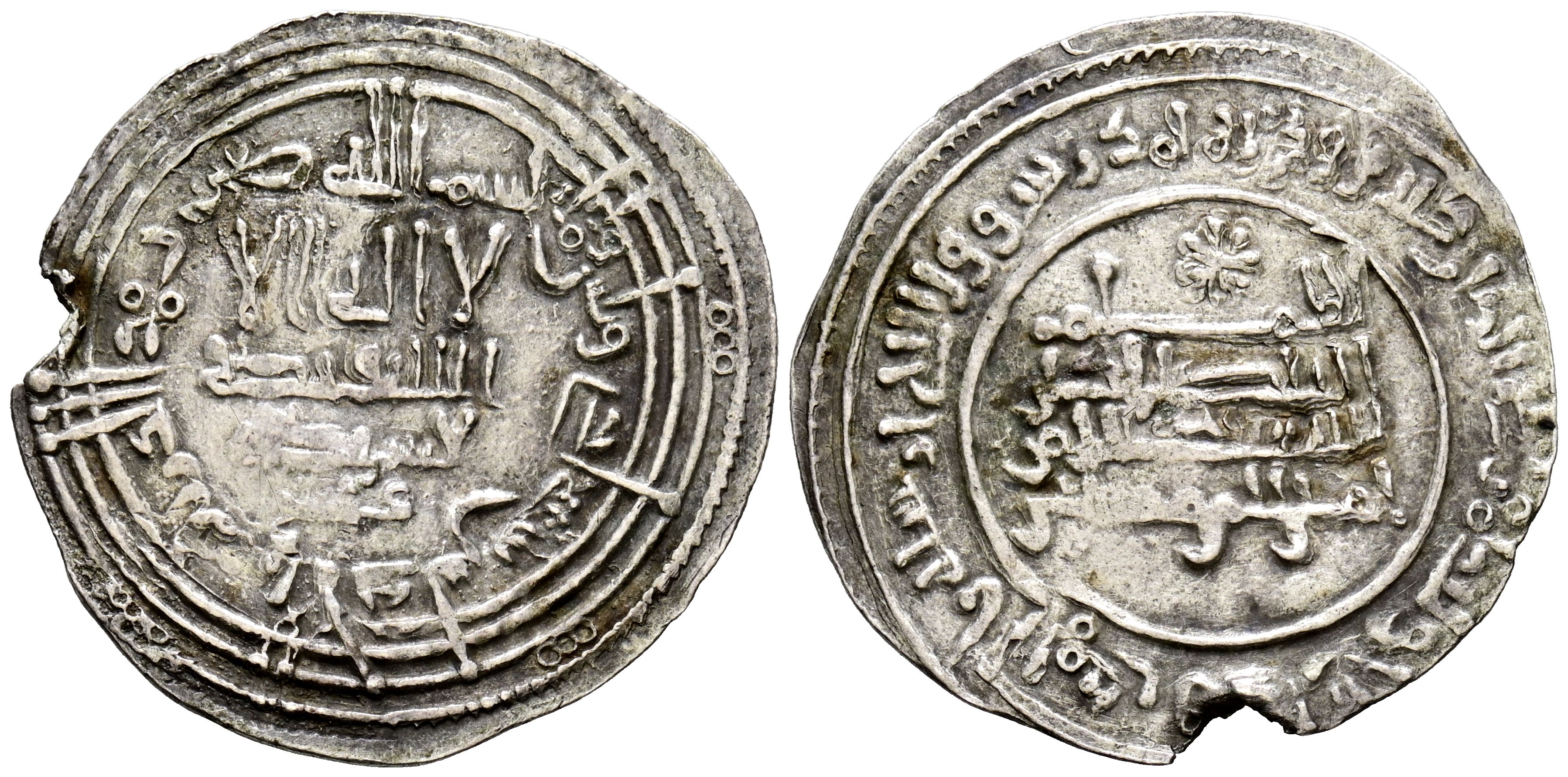 CALIFATO DE CÓRDOBA. ‘Abd al-Rahman III. Dirham. (Ar. 2,21g/25mm). 331H. al-Ándalus / الاندلس. (Vives-397; R.Frochoso-331.9). Citando a Qasim en IIA. MBC-. Golpe en el canto.