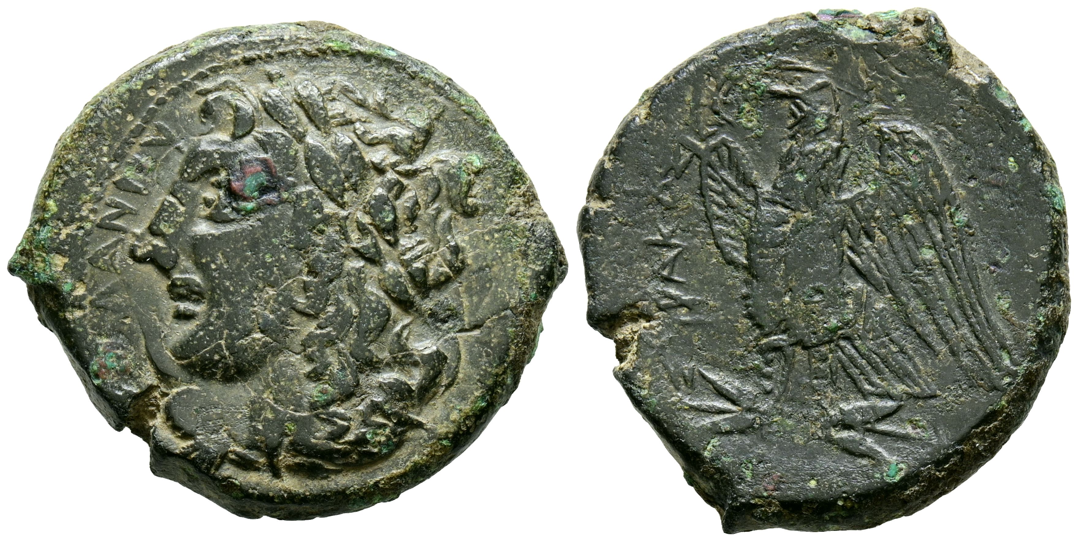 SICILIA, Época de Hiketas II. Ae26. (Ae. 10,66g/26mm). 287-278 a.C. Siracusa. (HGC 2, 1448) Anv: Cabeza laureada de Zeus a izquierda, alrededor leyenda: ΔΙΟΣ ΕΛΛΑΝΙΟΥ. Rev: Águila estante a izquierda sobre un rayos, delante leyenda griega: ΣΥΡΑΚΟΣΙΩΝ . MBC.