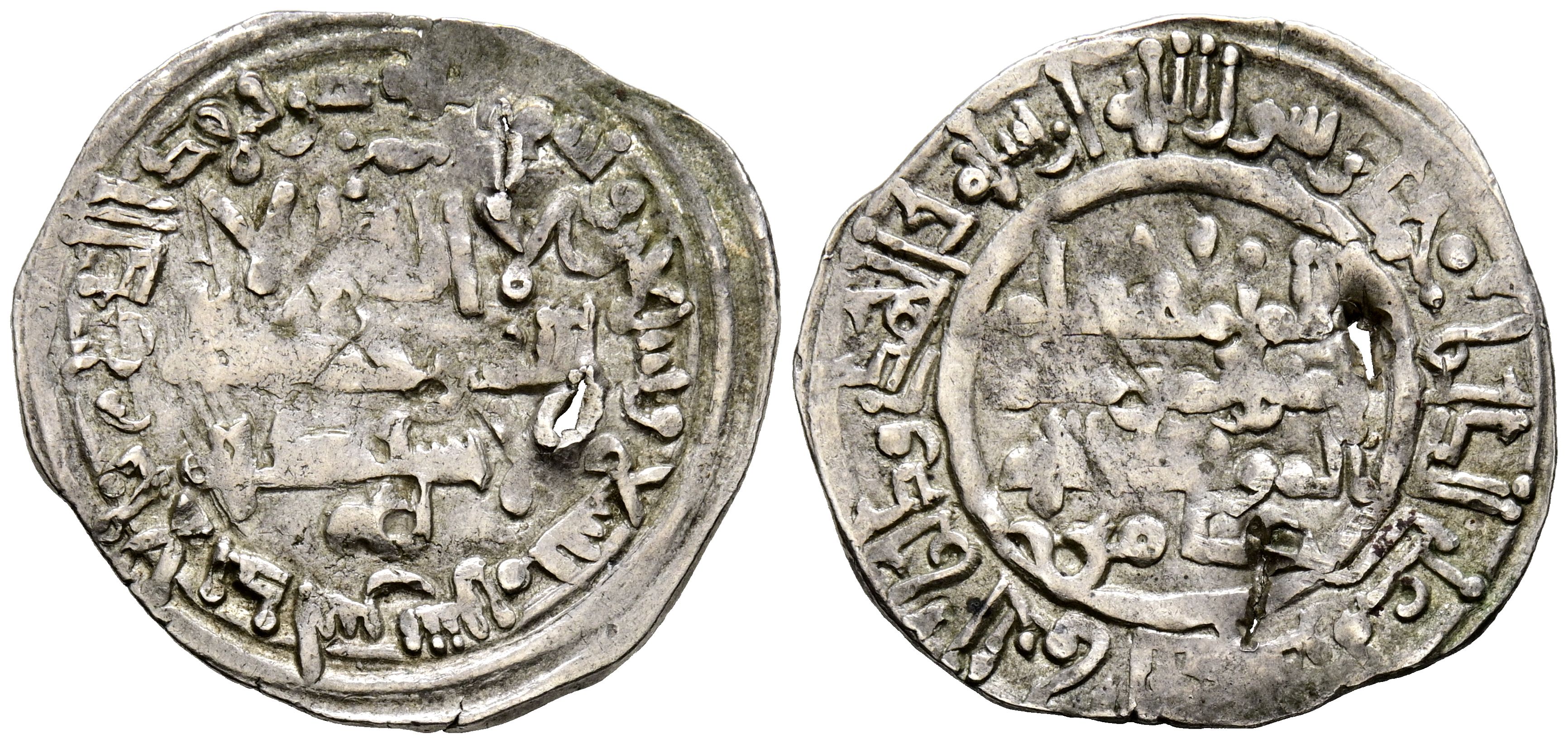 CALIFATO DE CÓRDOBA, Hisham II. Dirham. (Ar. 2,46g/24mm). 379H. al-Ándalus / الاندلس. (Vives 510; combinación de adornos no recogida en R. Frochoso 2009). Citando a Amir en IIA. MBC-. Perforaciones.
