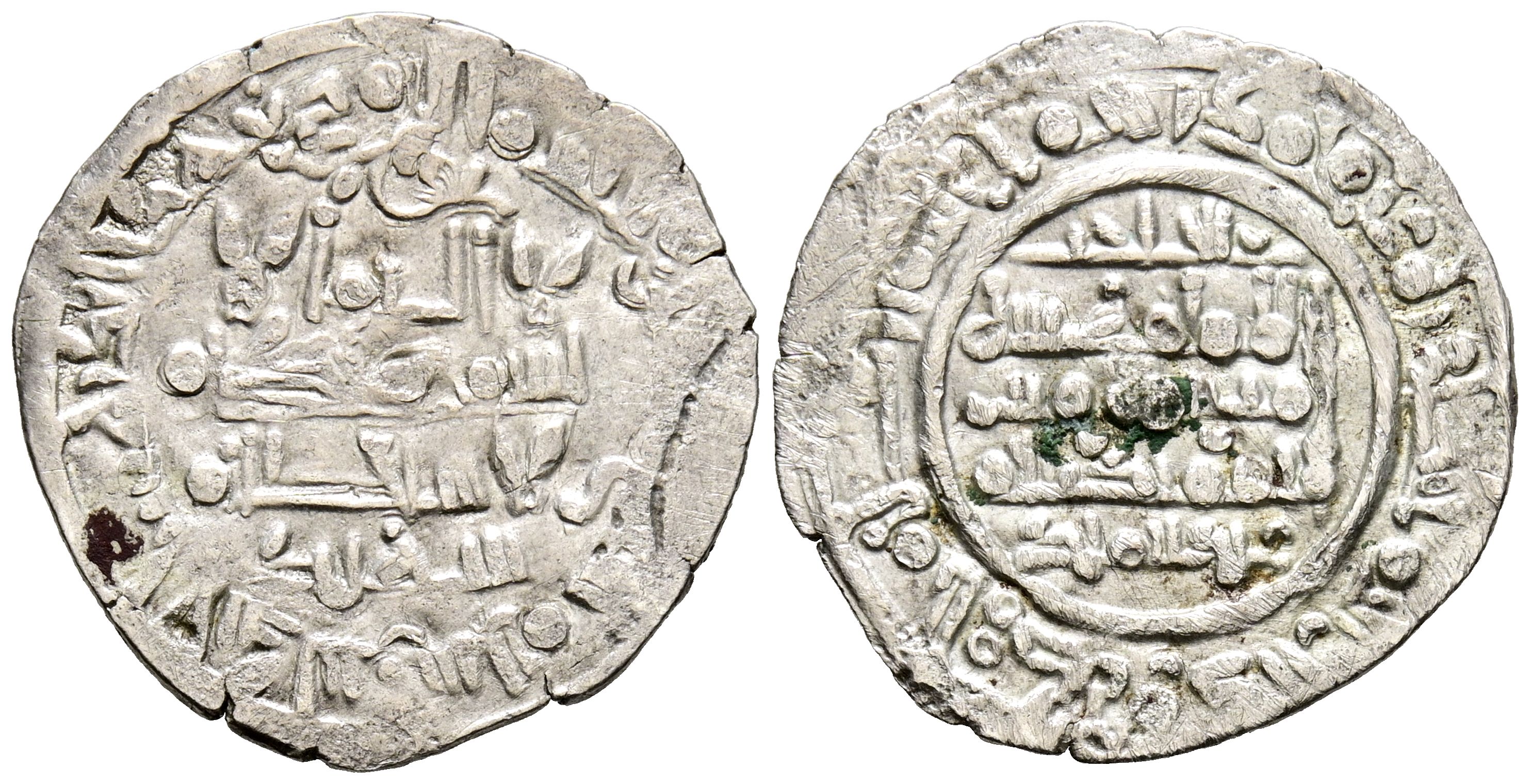 CALIFATO DE CÓRDOBA, Hisham II. Dirham. (Ar. 1,84g/21mm). 397H. al-Ándalus / الاندلس. (Vives 590; R.Frochoso 2009 397.49). Citando a Suhaid en la IA y al-Hayib / 'Abd Al-Malik en la IIA. MBC-. Manchas de oxidación.
