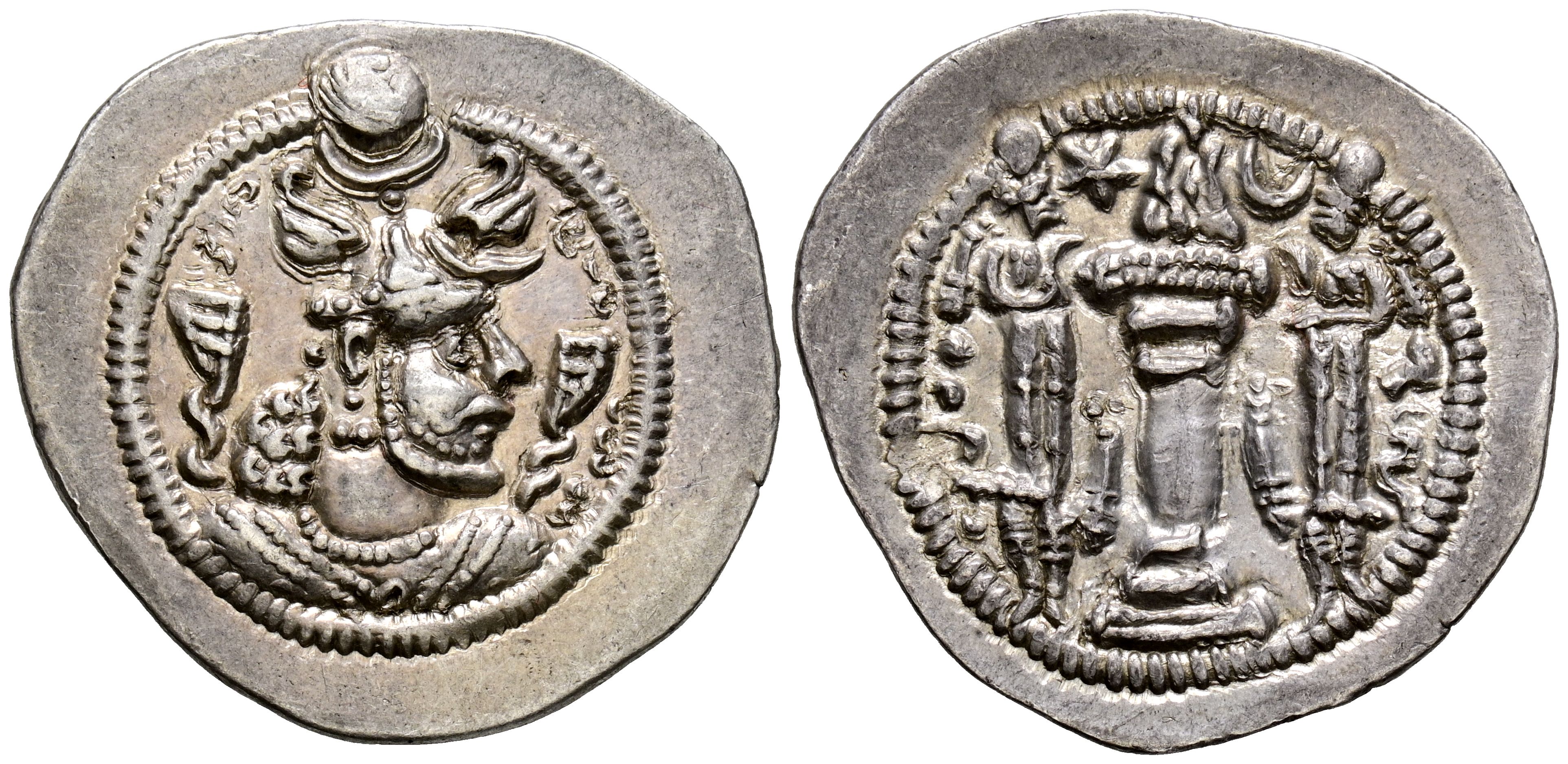 IMPERIO SASANIDA, Peroz I. Dracma. (Ar. 4,16g/27mm). 457-484 d.C. (Göbl-III/1). Anv: Busto coronado de Peroz I a derecha. Rev: Altar de fuego entre dos guardias, encima estrella y media luna. MBC.