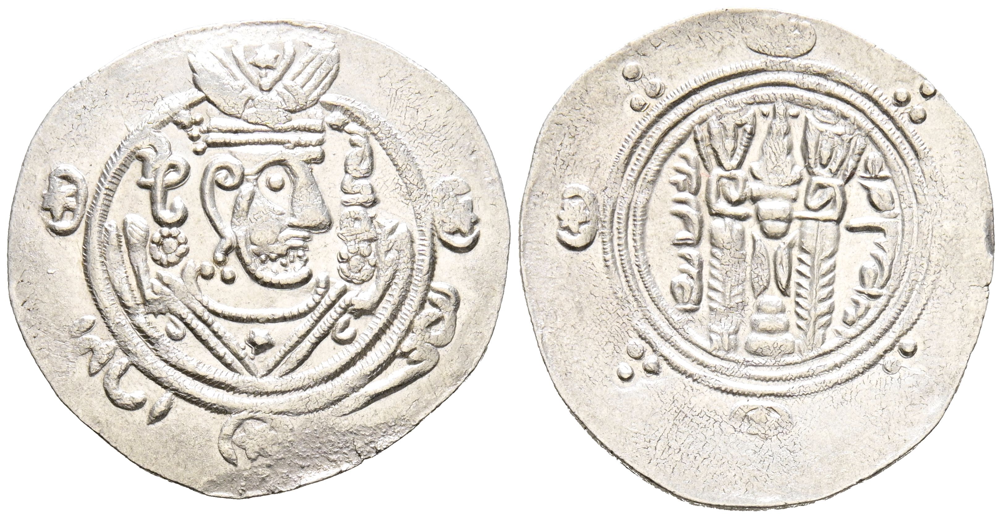CALIFATO ABASIDA, Anónimo. Dirham Tabari. (Ar. 1,85g/23mm). 136 PYE/171H/787-8 d.C. Tabaristán. Anv: Busto con corona alada mirando a derecha de tipo sasánida, leyenda en palavhi: a la derecha, ABZUD (Crecimiento) y a la izquierda, GDH (Explendor). En el exterior, a las 2h, 6h y 10h, creciente y estrella. Abajo a la derecha la palabra palavhi: ADB (Excelente) y a izquierda NEK (Bueno). Rev: Altar de fuego flanqueado por dos sacerdotes, a la derecha: Tapurstan (Tabaristán), y a izquierda año de acuñación: 136 PYE (Post Yazgard Era) dentro de 3 orlas, en el exterior, a las 12h, 3h, 6h y 9h creciente y estrella, y en medio de estos adornos 3 puntos en forma de triángulo. (Album73). MBC+.