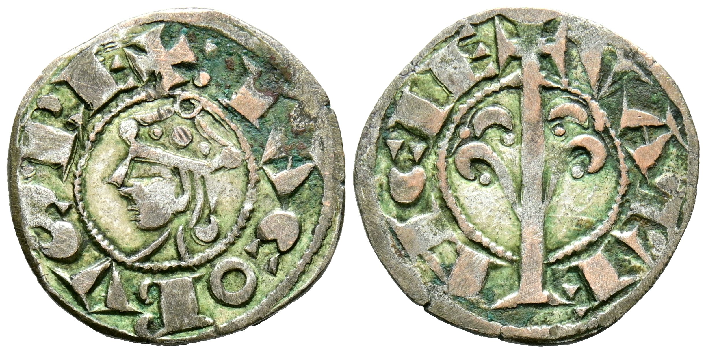 JAIME I (1213-1276). Dinero. (Ve. 1,26g/17mm). Valencia. (Cru.V.S. 316). Anv: Busto coronado de Jaime I a izquierda dentro de una gráfila circular, alrededor leyenda: IACOBUS REX. Rev: Arbol superado de la cruz con ramas de implantación bajas dentro de una gráfila circular, alrededor leyenda: VALENCIE. MBC.