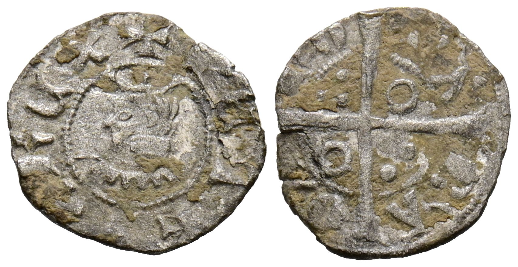 PEDRO III (1336-1387). Obolo. (Ve. 0,35g/12mm). Barcelona. (Cru V.S. 423). Anv: Efigie coronada de Pedro III a izquierda con diferentes adornos, alrededor leyenda: PETRVS REX. Rev: Cruz pasante con anillos y grupos de tres puntos, alrededor leyenda: BAQINONA. MBC-.
