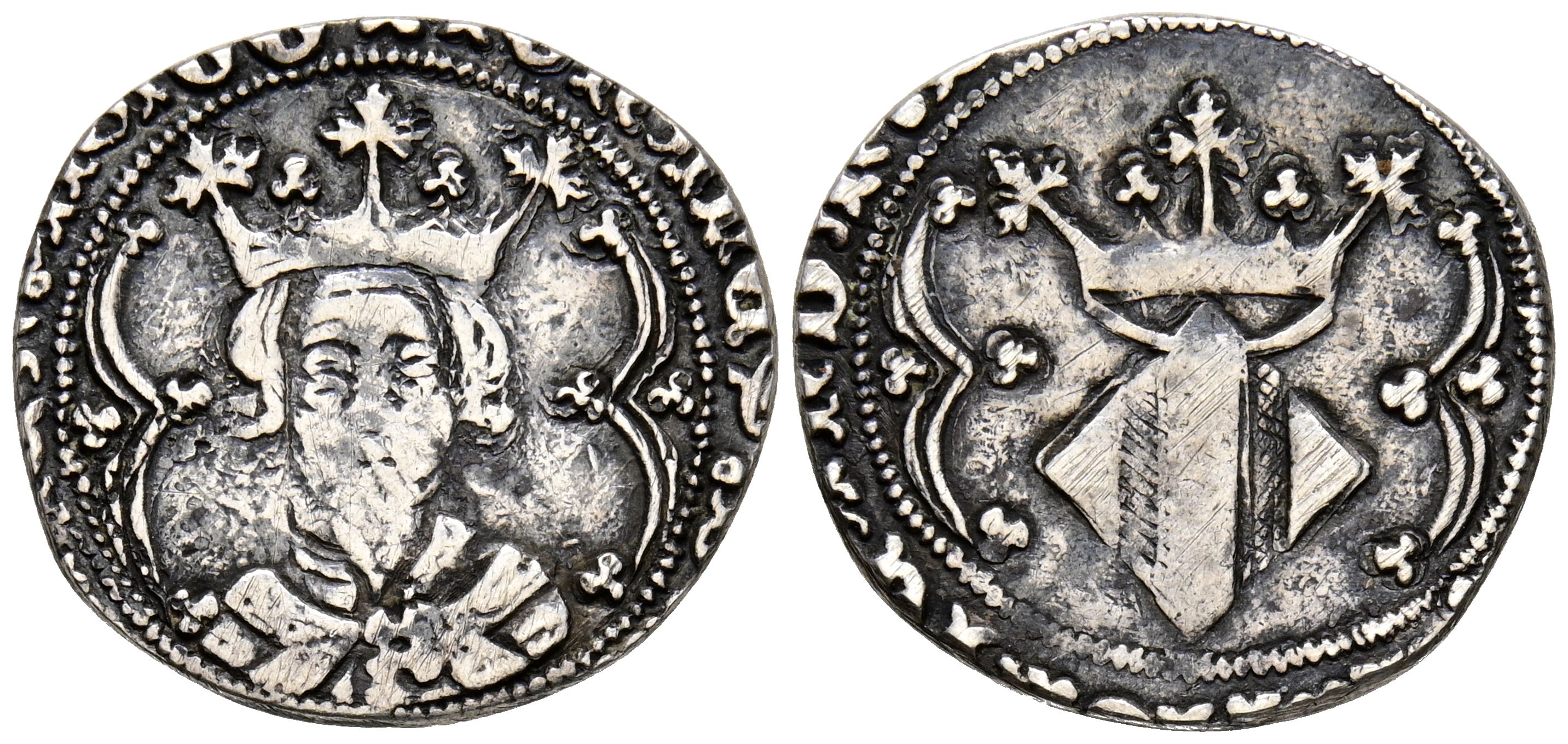 JUAN II (1458-1479). 1 Real. (Ar. 3,31g/23mm). Valencia. (Cru V.S. 966.4). Anv: Busto de Juan II coronado de frente dentro de una gráfila lobular, alrededor leyenda: IOHANES DEI GRACIA REX ARAGO. Rev: Armas de Valencia coronadas dentro de una gráfila lobular, alrededor leyenda: VALENCIE MAIORICARVM SER. MBC. Muy recortado. Escaso ejemplar.