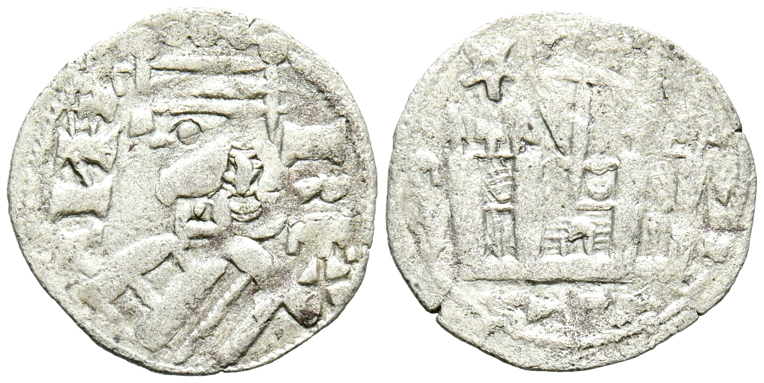 ALFONSO VIII (1158-1214). Dinero. (Ve. 0,68g/17mm). Incierta. (Imperatrix Tipo 36, adorno derecho de la torre no visible). Anv: Busto coronado de Alfonso VIII a izquierda, alrededor leyenda: ANFVS REX. Rev: Castillo con cruz central, sobre las torres estrella y ¿?, alrededor leyenda: CASTELE. MBC.