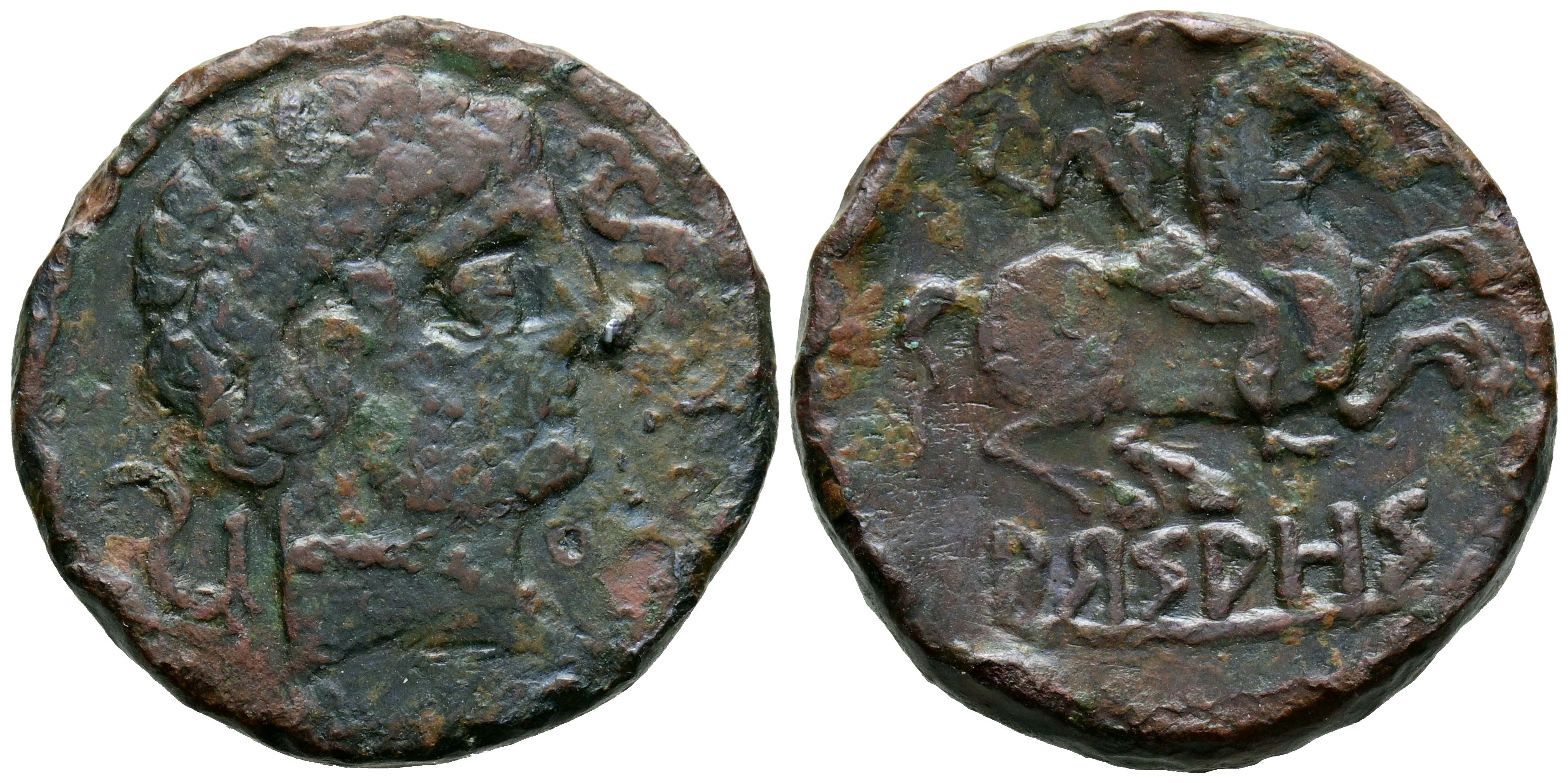 ARSAOS (Area de Navarra). As. (Ae. 8,87g/25mm). 120-80 a.C. (FAB-144). Anv: Cabeza masculina barbada a derecha, entre dos delfines. Rev: Jinete con dardo a derecha, debajo leyenda ibérica: ARSAOS. MBC-. Limpiado.