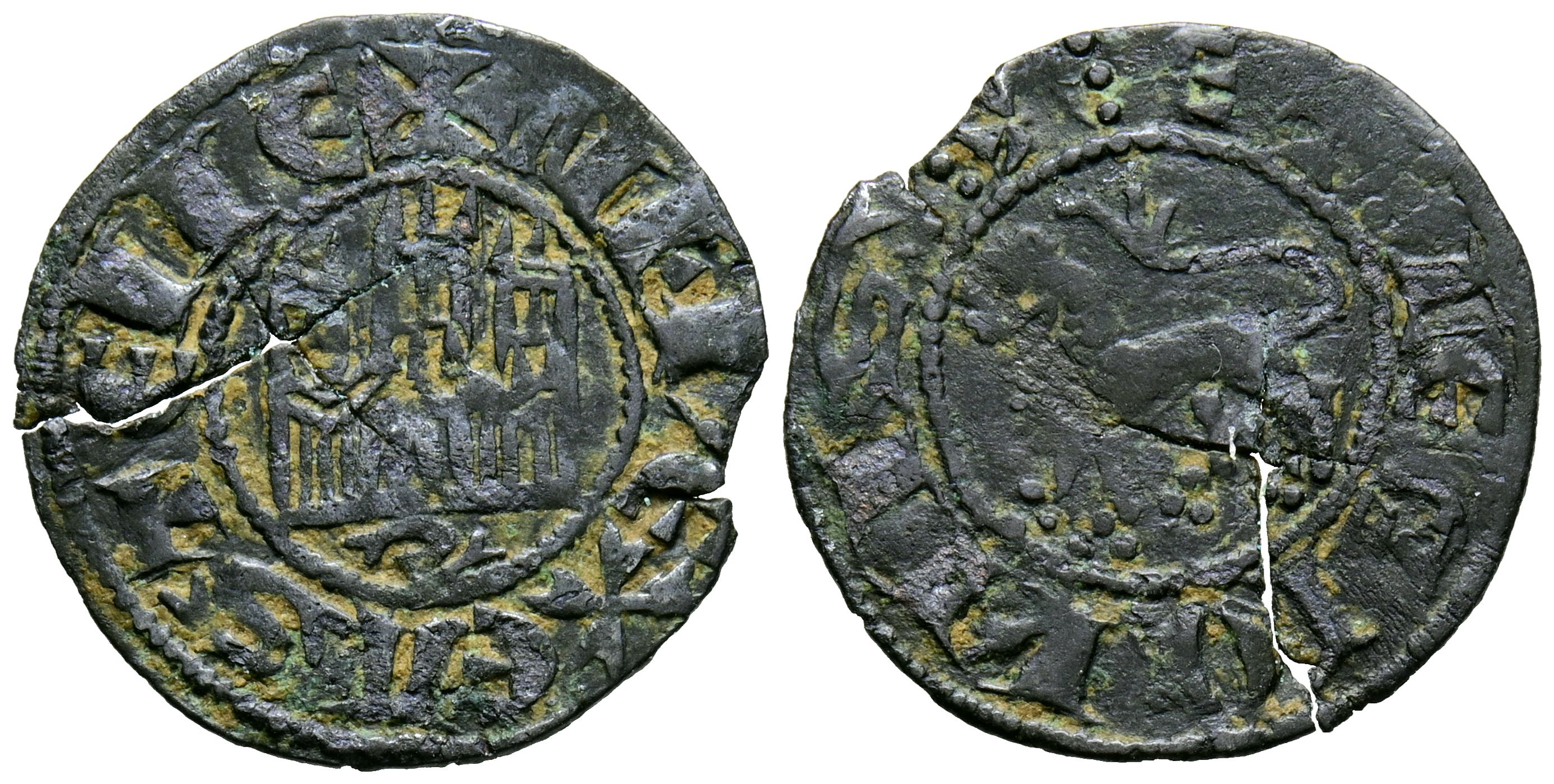ALFONSO X (1252-1284). Dinero prieto. (Ve. 1,12g/19mm). Sevilla. (Imperatrix A10:6.28, mismo ejemplar; FAB-254, como pepión). Anv: Castillo y debajo B dentro de gráfila circular, alrededor leyenda: ALF REX CASTELLE. Rev: León a izquierda dentro de gráfila circular, alrededor leyenda: ET LEGIONIS. MBC. Grieta.