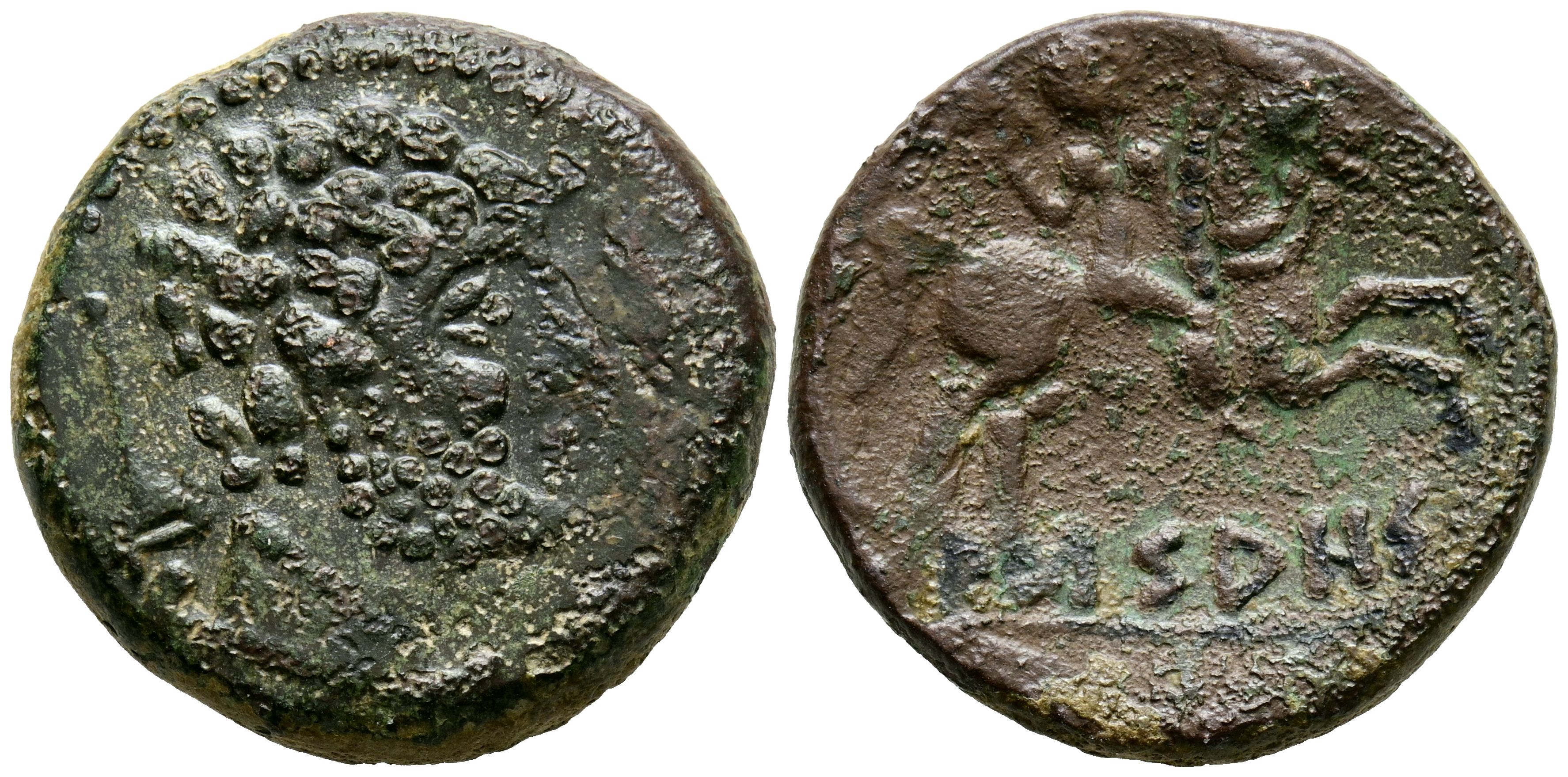 ARSAOS (Area de Navarra). As. (Ae. 11,02g/24mm). 120-80 a.C. (FAB-144). Anv: Cabeza masculina barbada a derecha, entre dos delfines. Rev: Jinete con dardo a derecha, las patas traseras del caballo estiradas, debajo leyenda ibérica: ARSAOS. MBC-. Limpiado.