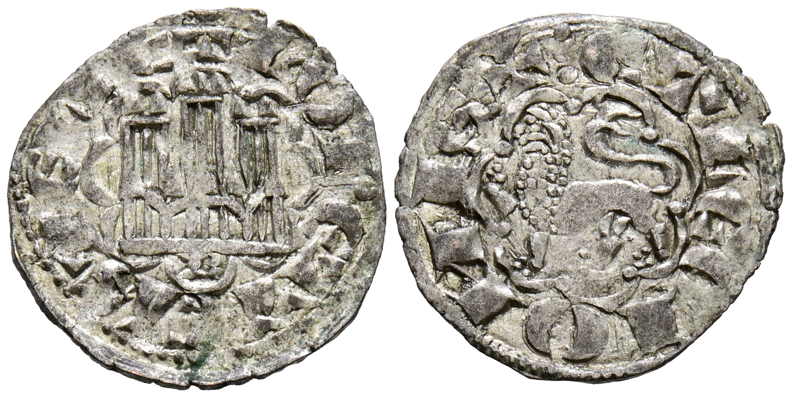 ALFONSO X (1252-1284). "Nueva Blanca" Alfonsí. (Ve. 0,79g/18mm). Burgos. (Imperatrix A10:11.7; FAB-263, como novén). Anv: Castillo y debajo B dentro de gráfila lobular, alrededor leyenda: MONETA CASTELLE. Rev: León rampante a izquierda dentro de gráfila lobular, alrededor leyenda: ET LEGIONIS. MBC+. Bonito ejemplar. Vellón rico.