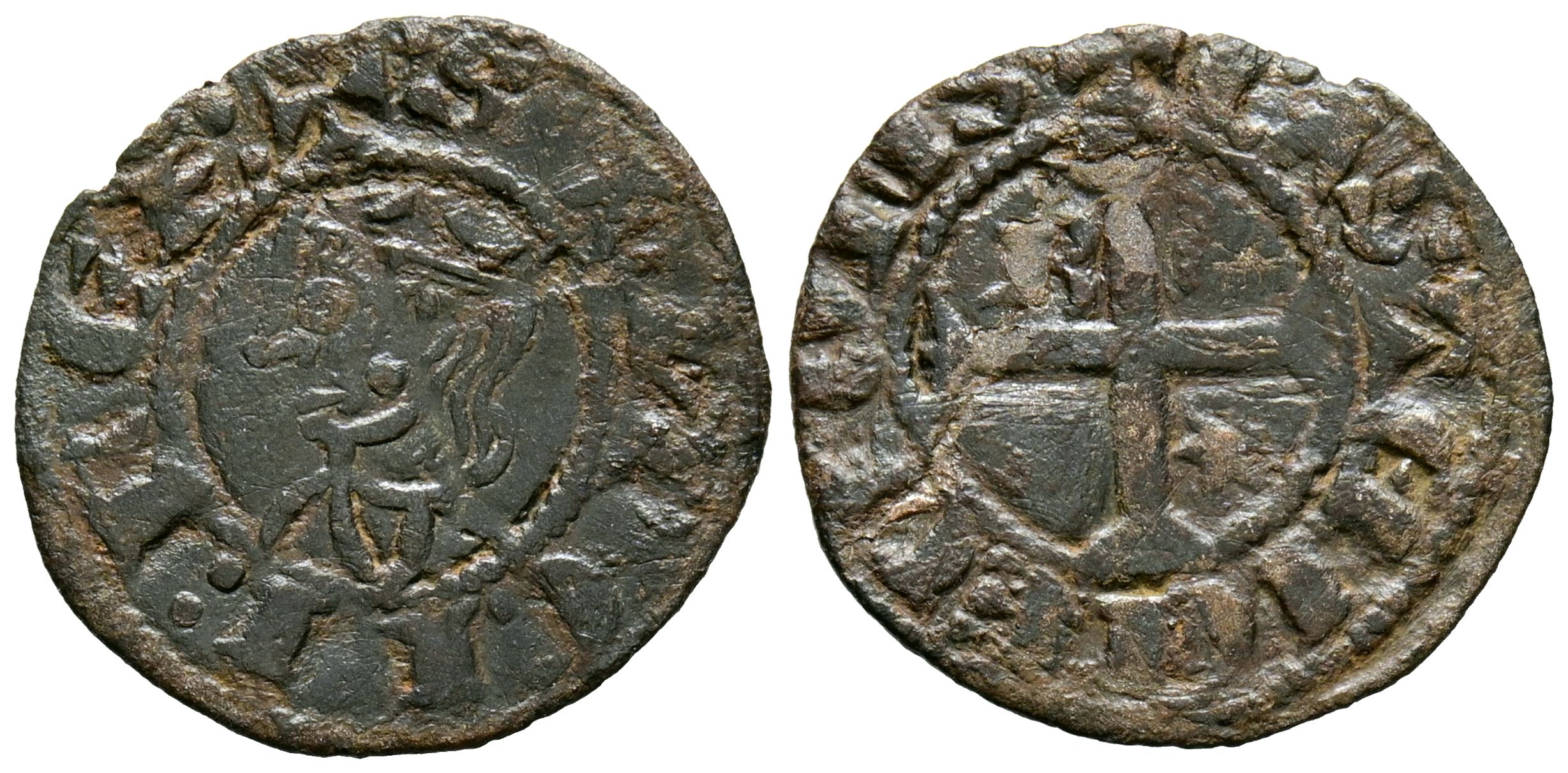 SANCHO IV (1284-1295). Meaja Coronada. (Ve. 0,65g/17mm). Burgos. (Imperatrix S4:6.5; FAB-316, como seisén). Anv: Busto coronado de Sancho IV a izquierda, alrededor leyenda: SANCII REX. Rev: Cruz patada con B en primer cuadante y estrella en el cuarto, alrededor leyenda: CASTELLE E LEGIONIS. MBC.