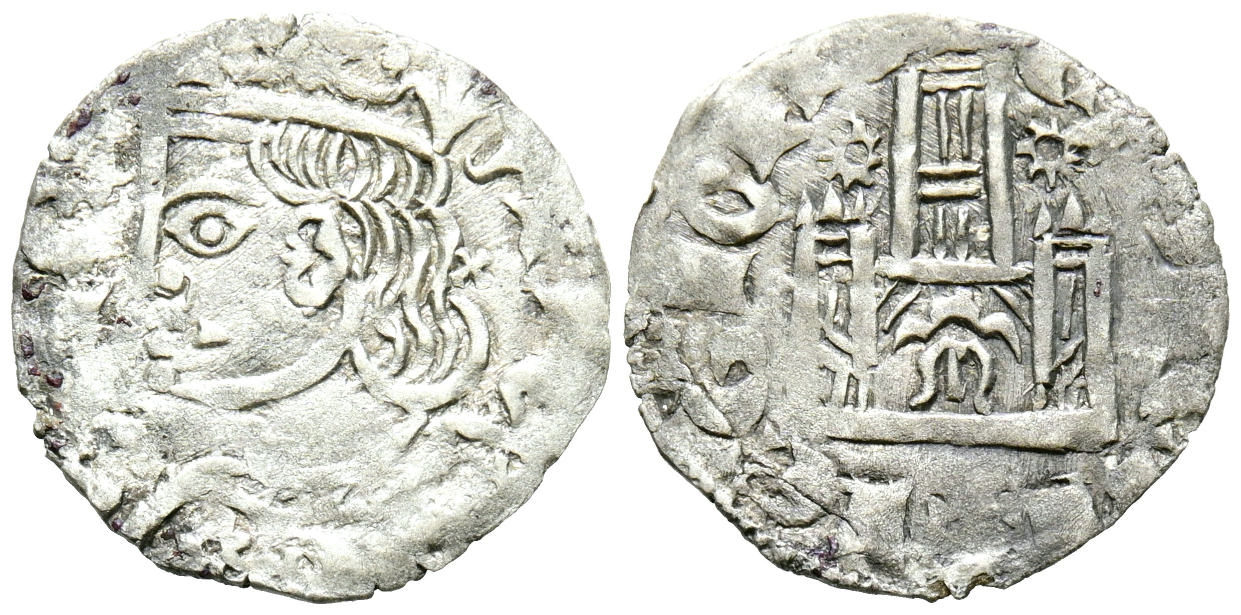 ALFONSO XI (1312-1350). Cornado. (Ve. 0,69g/17mm). Murcia. (Imperatrix A11:2.12; FAB-339.2, variante X detrás del busto). Anv: Busto coronado de Alfonso XI a izquierda, detrás X, alrededor leyenda: ALFONS REX. Rev: Castillo, en la puerta marca de ceca M, entre la torre principal dos aros estrellados, alrededor leyenda: CASTELLE ET LEGIONIS. MBC.