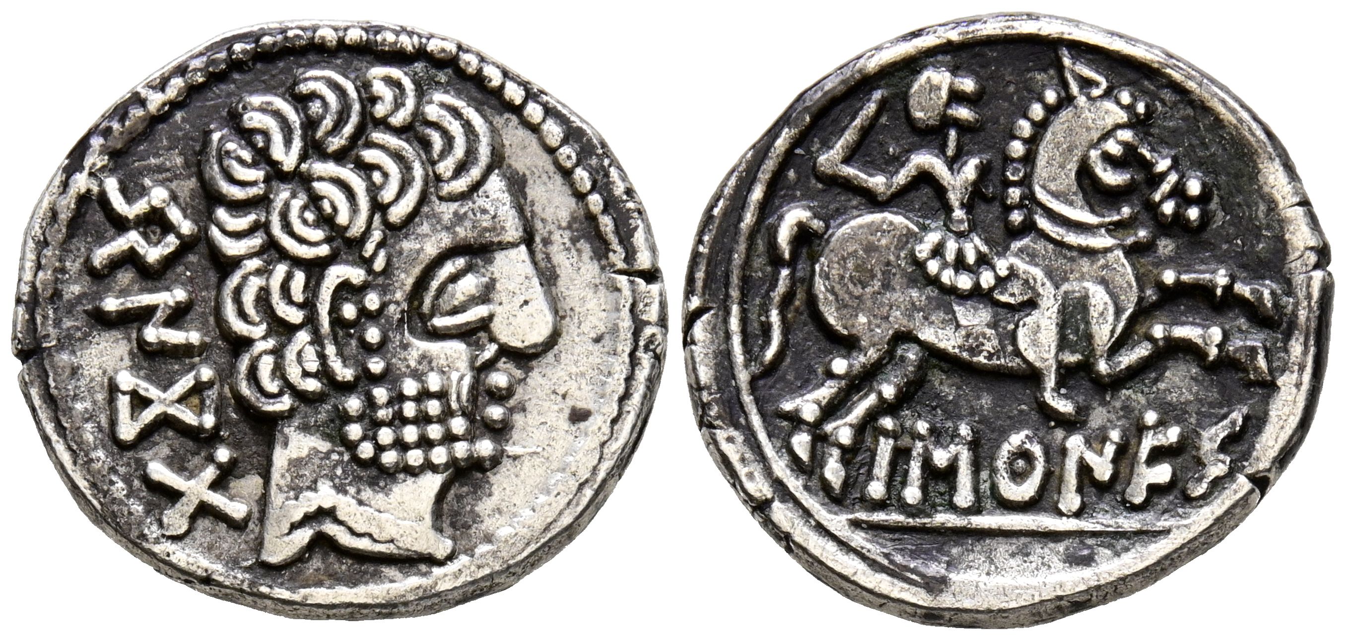 BASCUNES (Pamplona). Denario (Ar. 4,01g/19mm). 120-20 a.C. (FAB-215). Anv: Cabeza masculina barbada a derecha, detrás leyenda ibérica BeNCoDa. Rev: Jinete con espada a derecha, debajo leyenda ibérica BaSCuNES. MBC+.